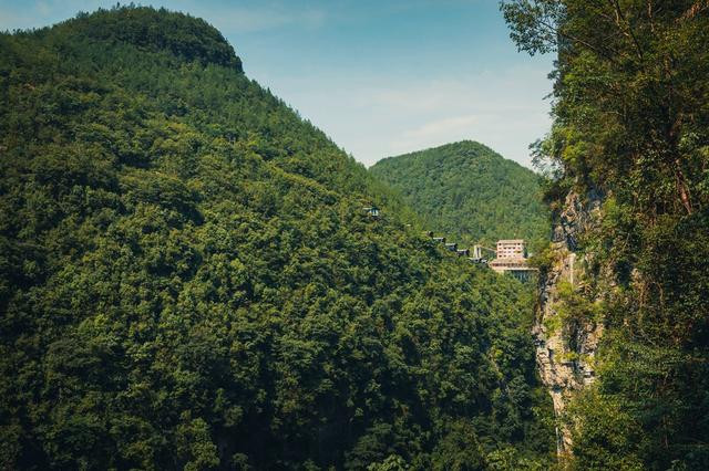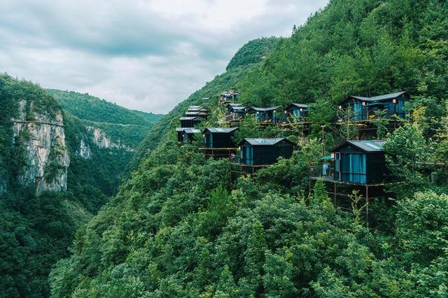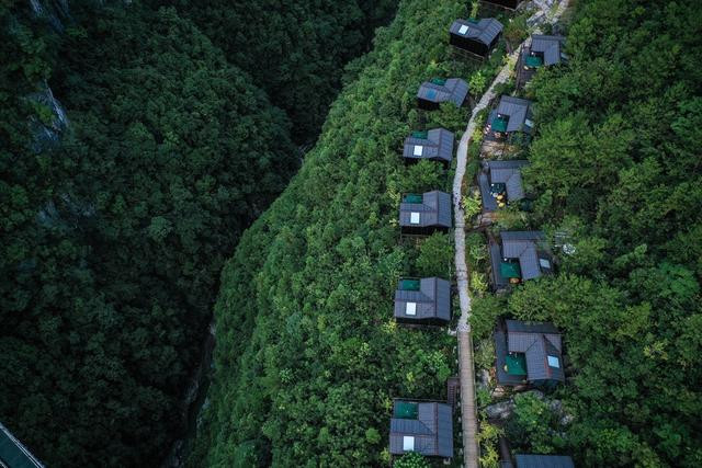 20几座小屋顺着山势屹立于356米高的悬崖绝壁之上,背靠群山,面朝峡谷,远看仿佛是青山绿水间的童话小屋,从空中和对面看都非常震撼。