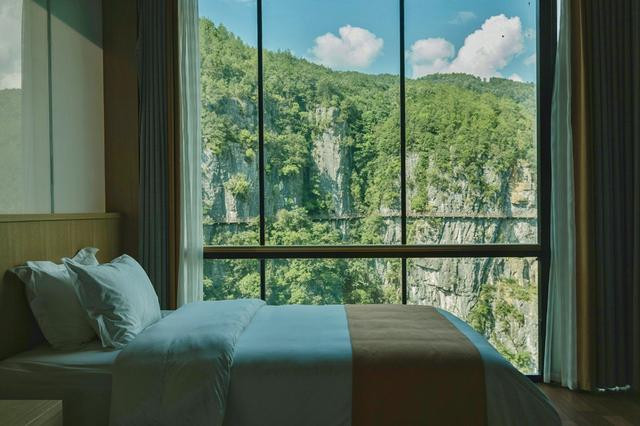 每栋小屋就是一个套房,还有个玻璃阳台,透明的落地大玻璃外就是巍峨的山崖和险峻的山谷,还可以遥望不远处的玻璃吊桥。