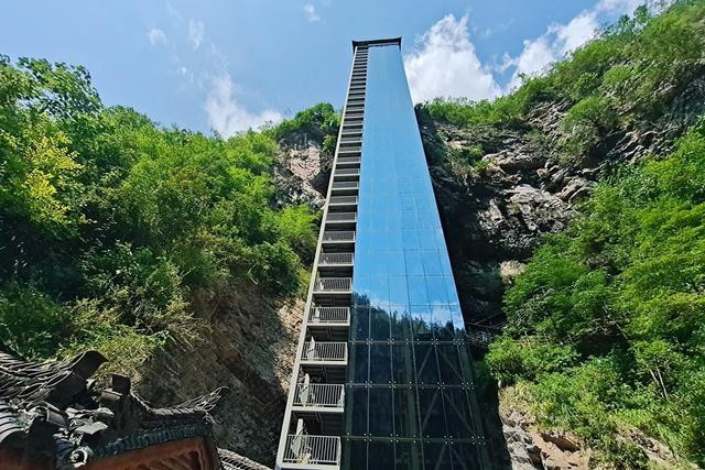 最后从谷底登上直上直下的绝壁电梯,这是个用钢筋混凝土与钢结构结合设计而成的电梯,总高度约为180米,外面看为全透明的观光电梯,还挺酷,进去后能从谷底至山顶将景色一览无余,几十秒从谷底到山巅,绝对刺激