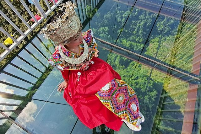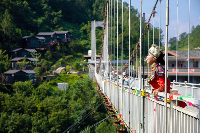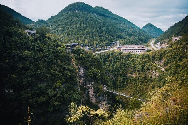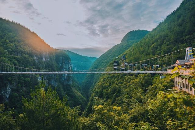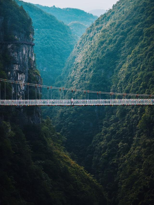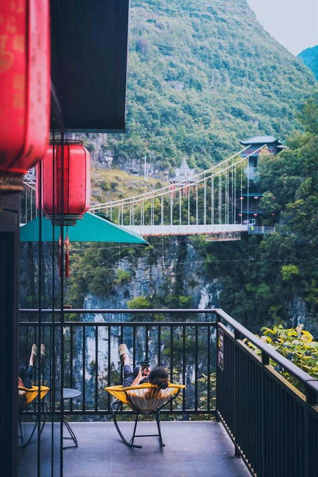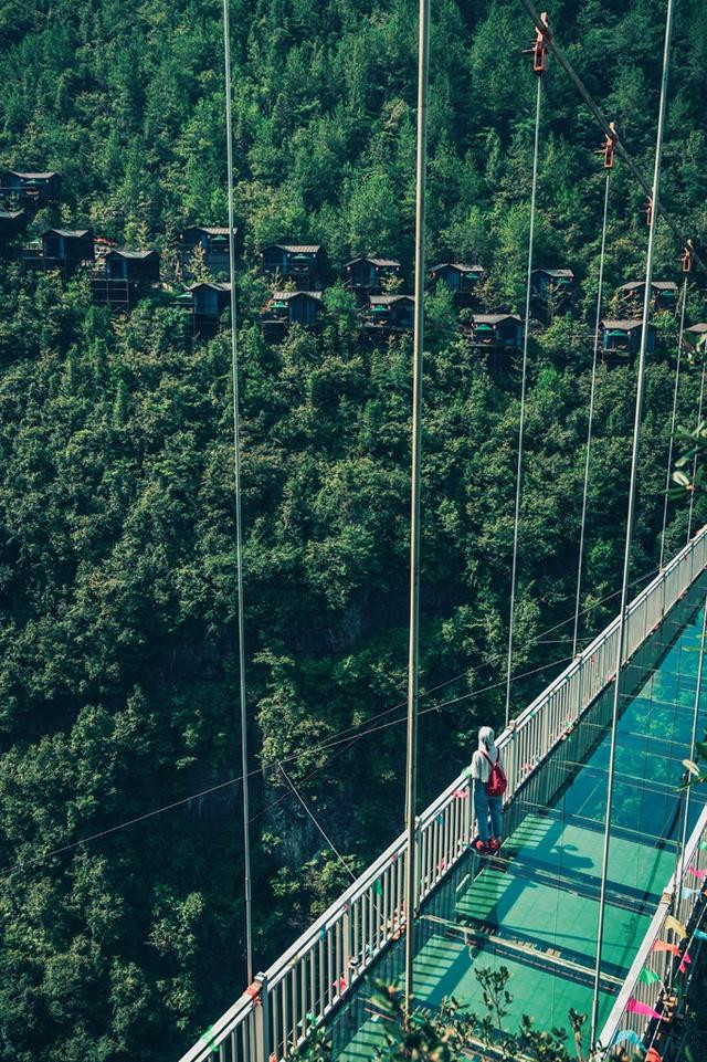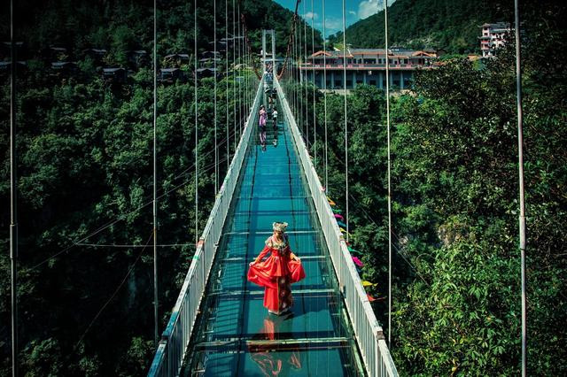 地标的网红玻璃桥,就在入口与佳音亭两岸的山谷深涧之间,横跨286米。走上透明玻璃,脚下就是万丈深渊,恐高的走上去最好别往下看,加上人走过会有晃动,有种心跳加速的感觉。这地方很适合拍美照,背景就是网红悬崖酒店,穿上土家族服装真是美爆了。