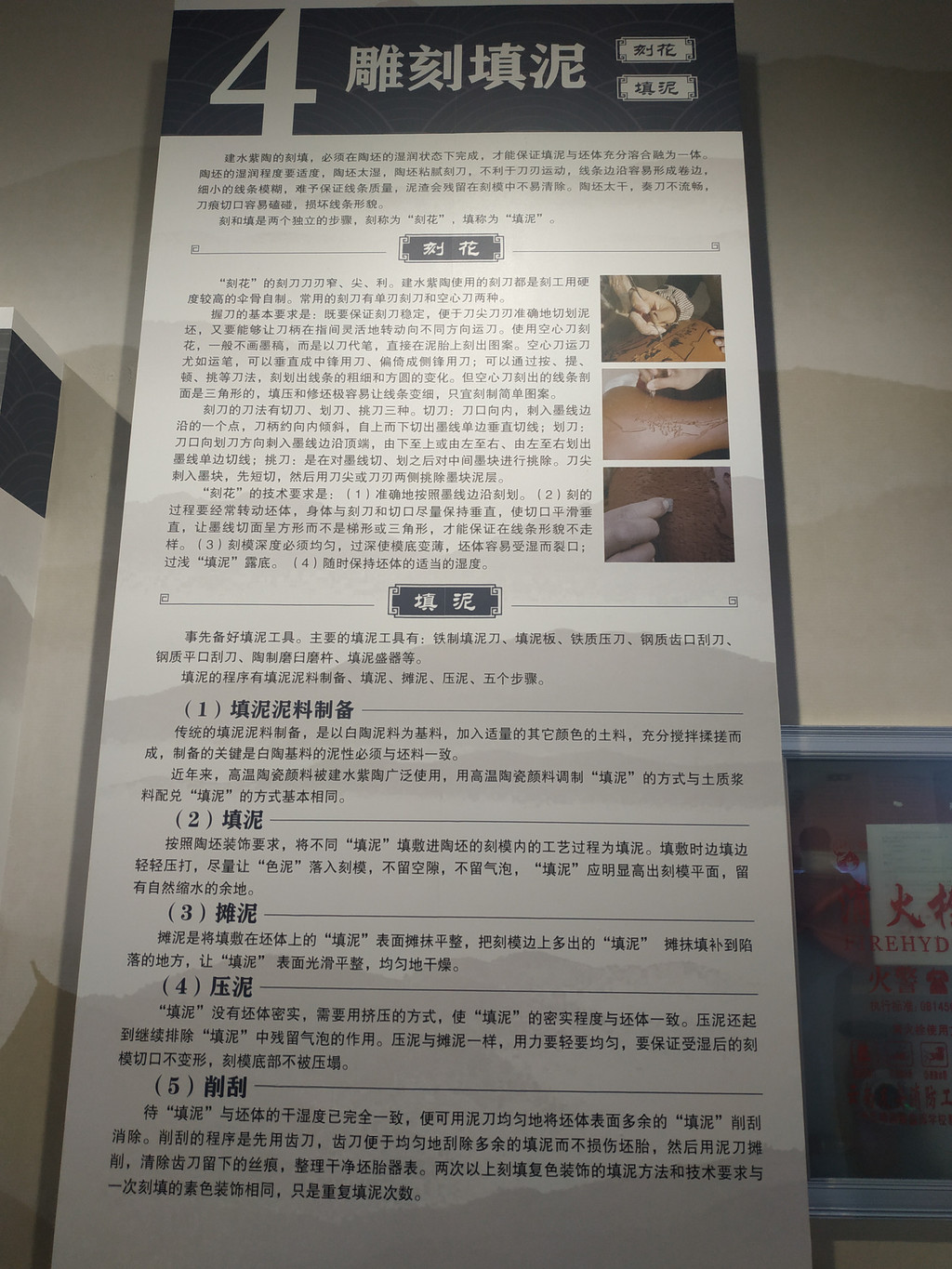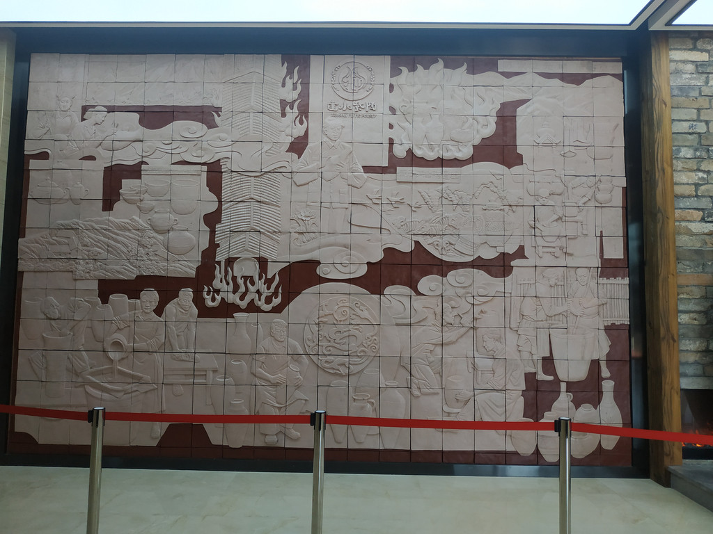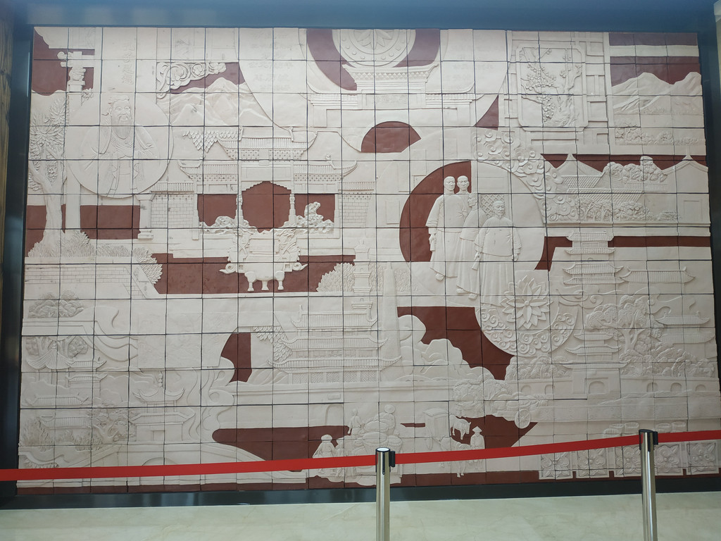 用紫陶陶片组合的建水主要古迹和紫陶制作过程的浮雕
