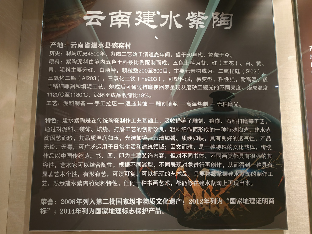 建水紫陶为四大名陶,县里两张名片为“千年古城临安”(建水古为临安府)和“千年建水紫陶”,可见紫陶在建水的地位。