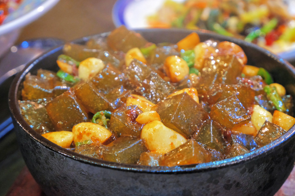 炒凉粉: 用红薯或绿豆淀粉打制,佐以豆酱、葱、姜、蒜,用香油炒制而成。入口热鲜香嫩,凉粉晶莹剔透,滑嫩不碎,素有“凉粉管炒”之美誉。