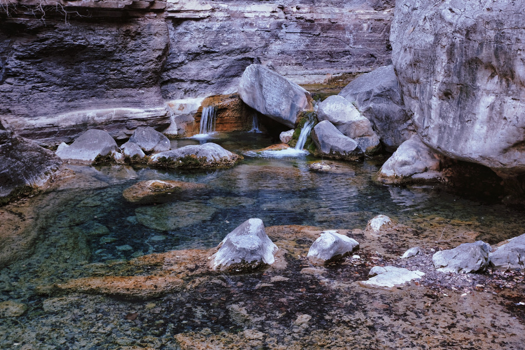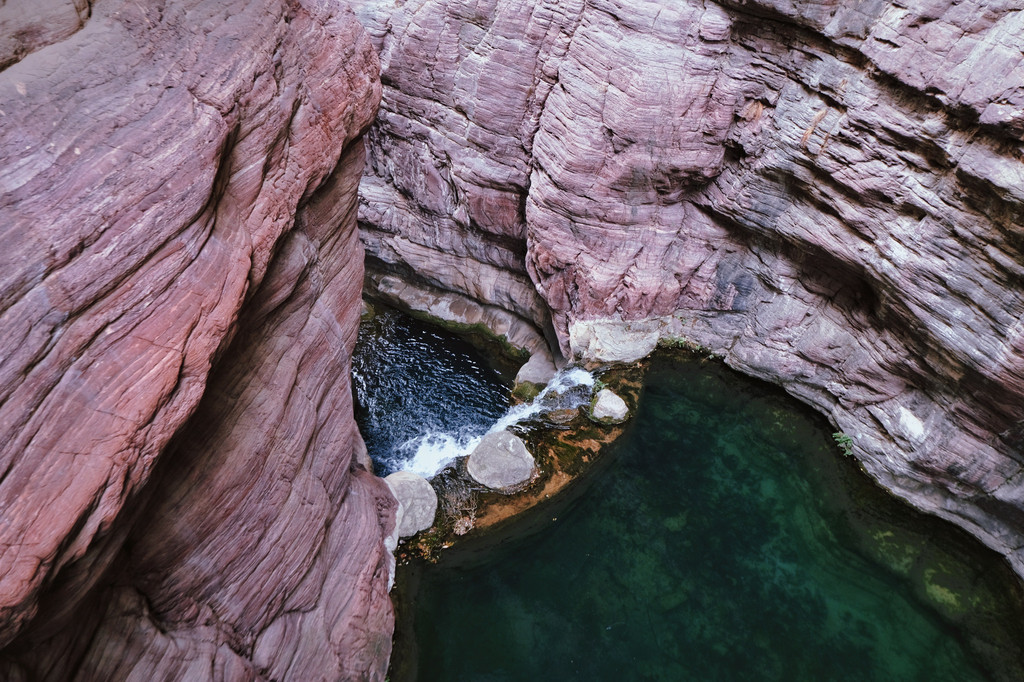 2公里蜿蜒的峡谷,深藏于68米的地下,紫红色的石英岩层层叠叠,红岩似火,和翡翠般的潭水相得益彰,形成了秀气妩媚的峡谷奇观。