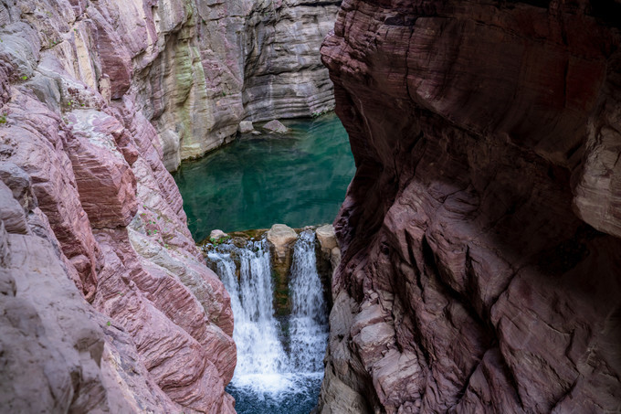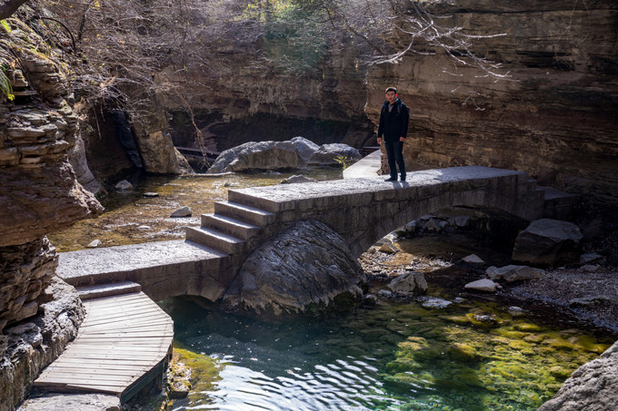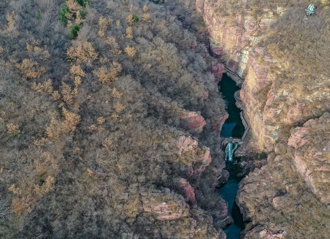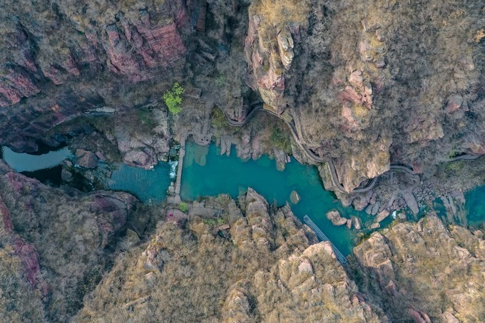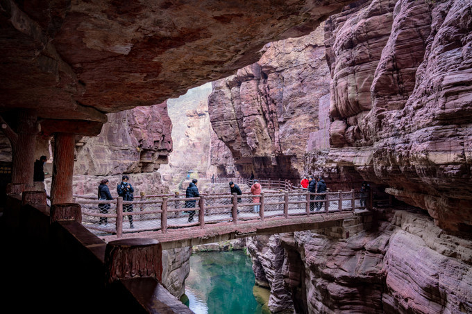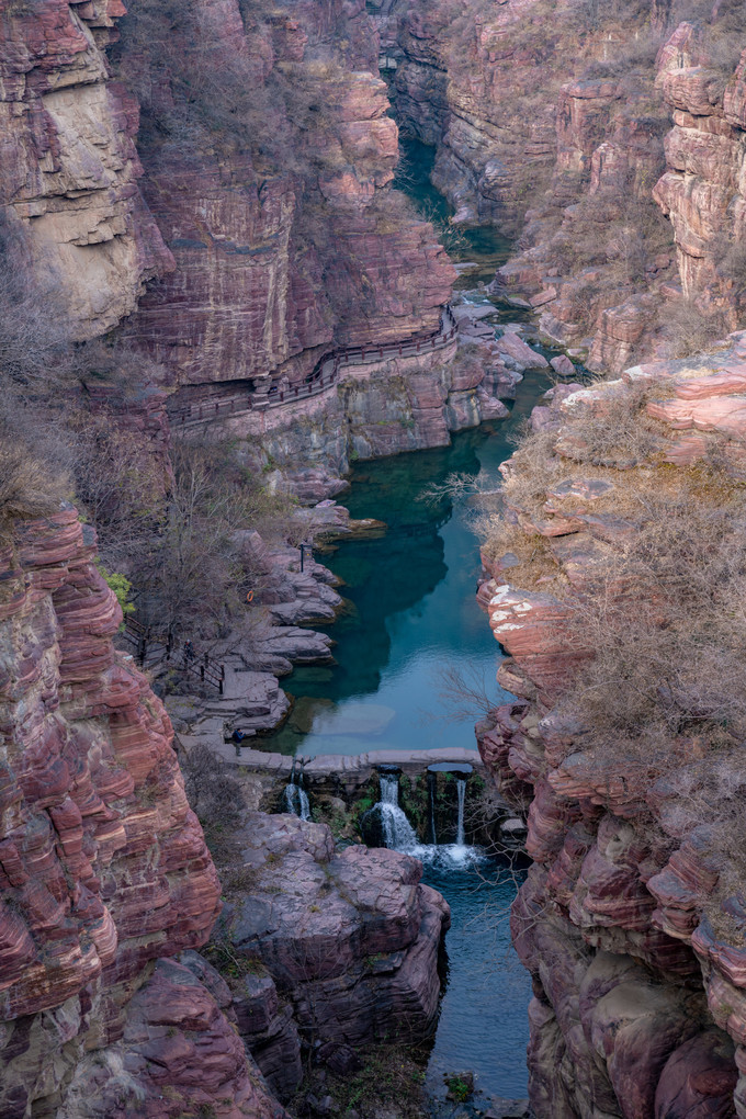 从红石峡的入口石桥上,可以俯瞰峡谷的纵深至美,峡谷底部的溪水碧绿清澈,从这么远的距离望过去,都能看到水底的石头。峡谷细长幽深,仿佛在大地上一斧辟出了另一幅天地,巍巍壮观,大气磅礴。