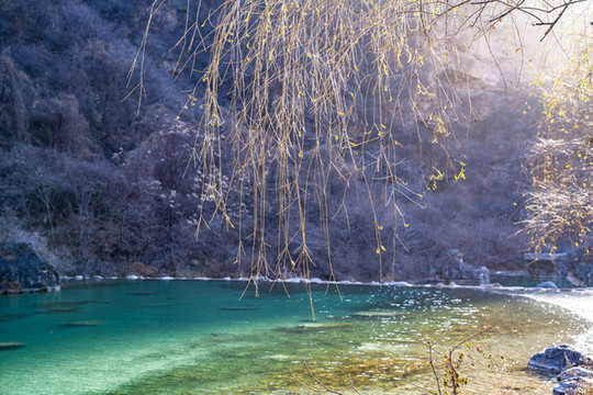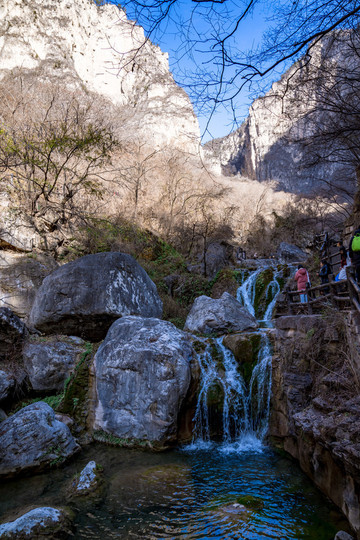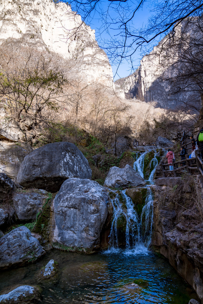 沿峡谷逆水而上,情人瀑、金龙卧波、丫字瀑、不老泉、水帘瀑等水景跌宕声声,潭瀑成对成串,鳞次栉比,成趣相欢。秀美的景色引得游客连连驻足,三步一停,五步一定,流连忘返,手机、相机各种拍摄设备不停的按下快门。小寨沟里奇石很多,形状各异,晴朗的天空上还有云在流动,随是寒冬季节,却有南国风情。
