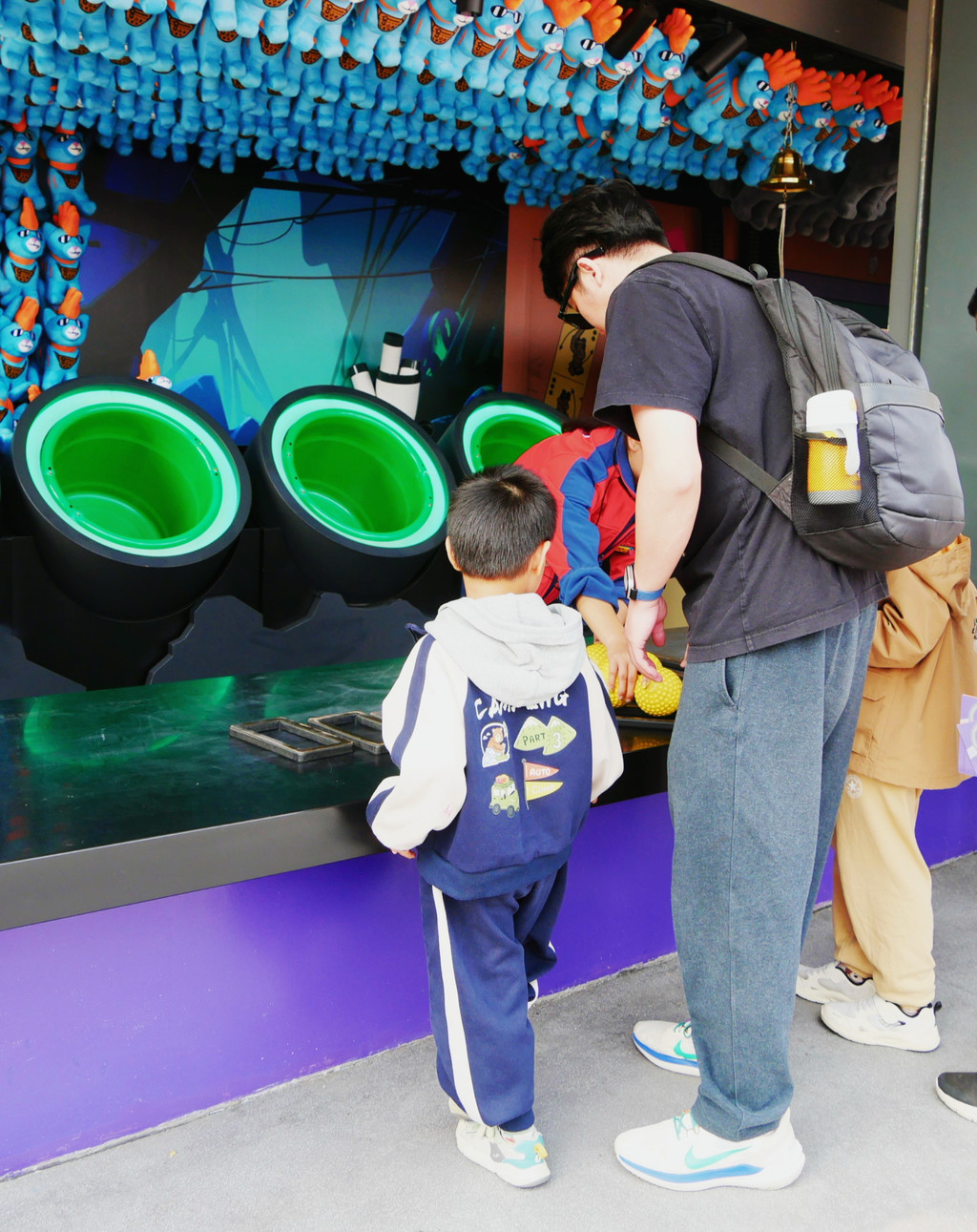 路上随便找了个互动的项目,把小黄球扔到绿桶里保证不能弹出来,有在商店买不到的人偶只能通过游戏才能得到的,每个游戏点的人气都很旺,以成年人居多。