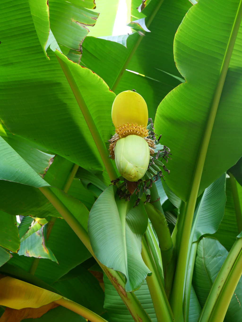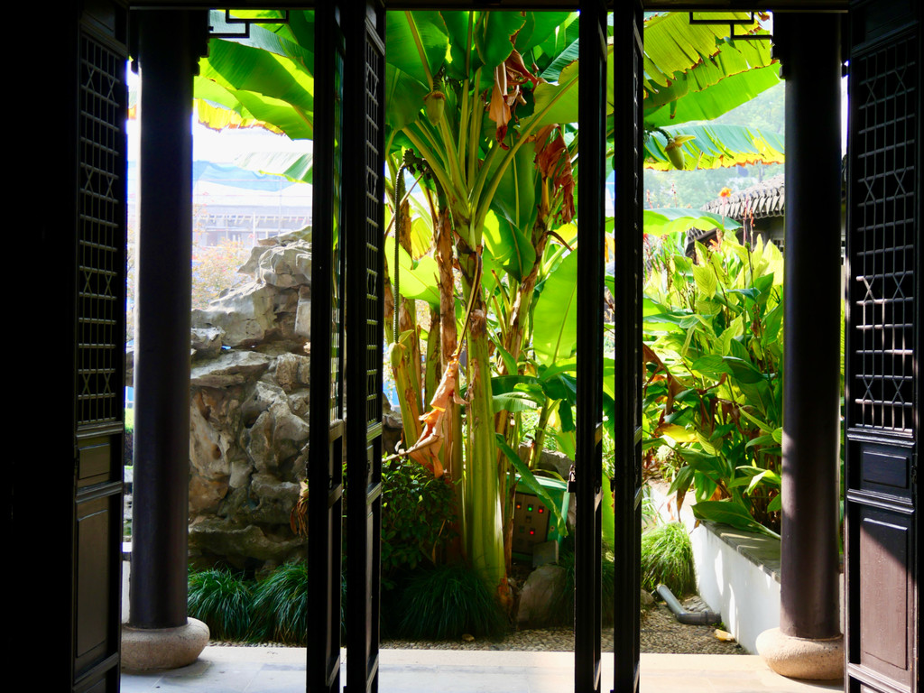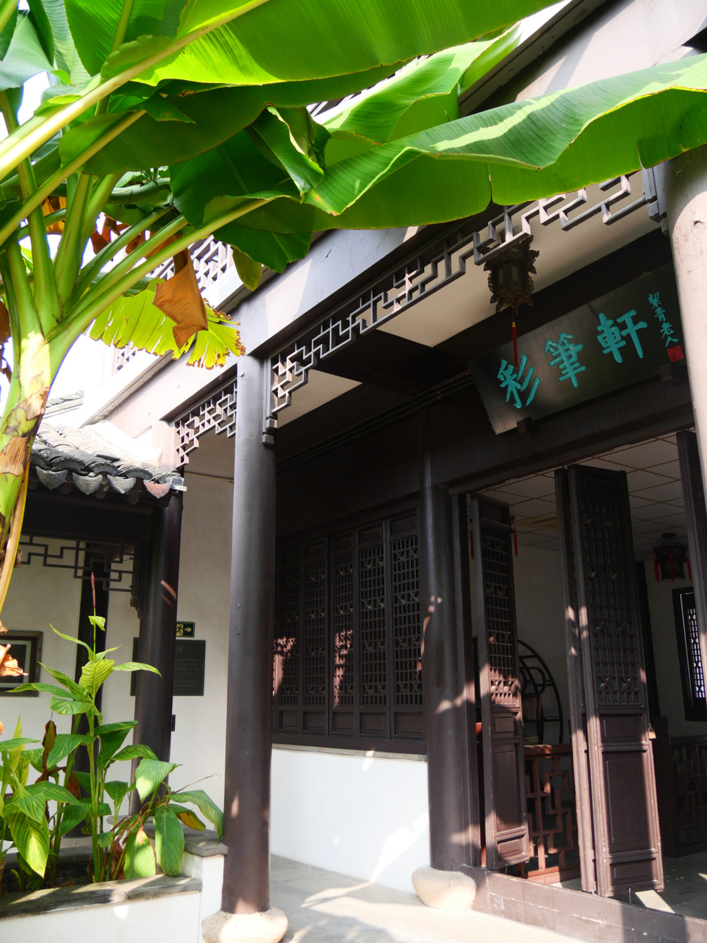 进门是一条石刻长廊,彩笔轩门口的芭蕉树已经结果了,春华秋实,岁物丰成。