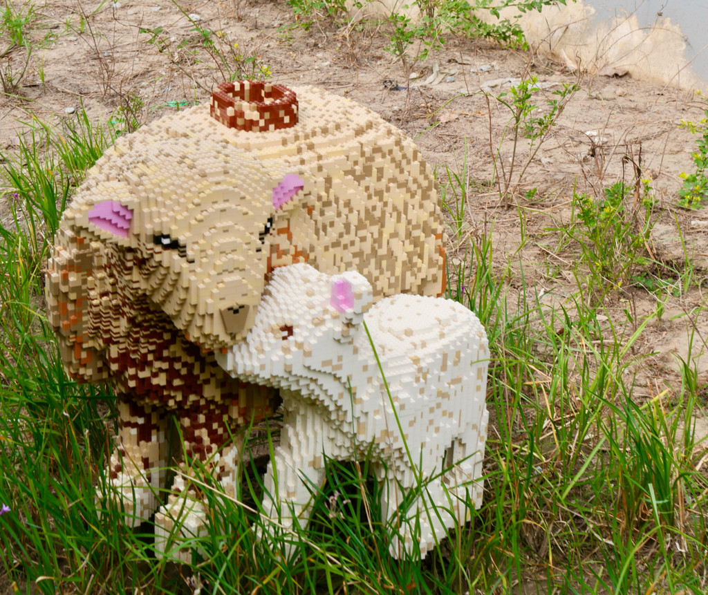 坐在小火车上随处可见的乐高大积木搭建的小动物,羊妈妈和小羊羊的贴贴。