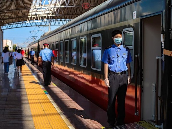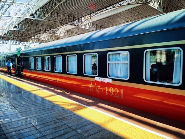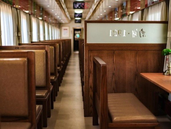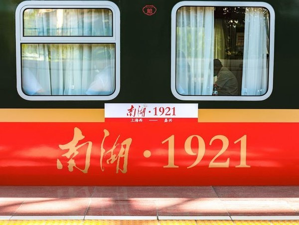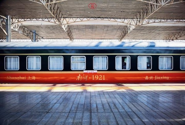 “南湖1921”红色主题列车由2节红色主题功能车厢和7节普通车厢组成。