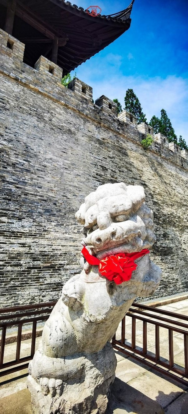 这座“浙江现存唯一城墙上的古城楼”,是1990年重修的,长约百米,垣墙为砖石结构,城上设有垛口,下置城门,门为木质,门口有石狮镇守,石狮子的腿脚已经没有了,说明这座城墙的历史之久远。