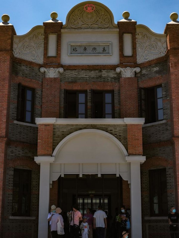 来之前我专门研究了一下这座火车站到历史,这座火车站是1907年建设,1909年投入使用,已经一百多岁了,是链接上海和杭州这一条线上重要的交通枢纽。眼前的这栋建筑虽然是复刻的,但也绝对用心。建筑采用了近13万块南湖湖心泥烧制而成的青砖和红砖,在近5000块砖上刻印“嘉兴2021”等字样,可以说当年红船的星星之火,如今在革命启航地依旧熊熊燃烧。