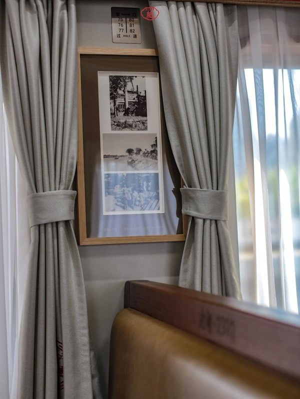 我乘坐的是2号车厢,一走进来就是浓浓的复古风。与平时的绿皮车厢不同的是,这列车的复古车厢座椅都是暗黄色的,列车车窗窗帘红色元素刺绣,座位小桌板下配备充电插座及USB接口,兼顾现代人使用要求,非常暖心。