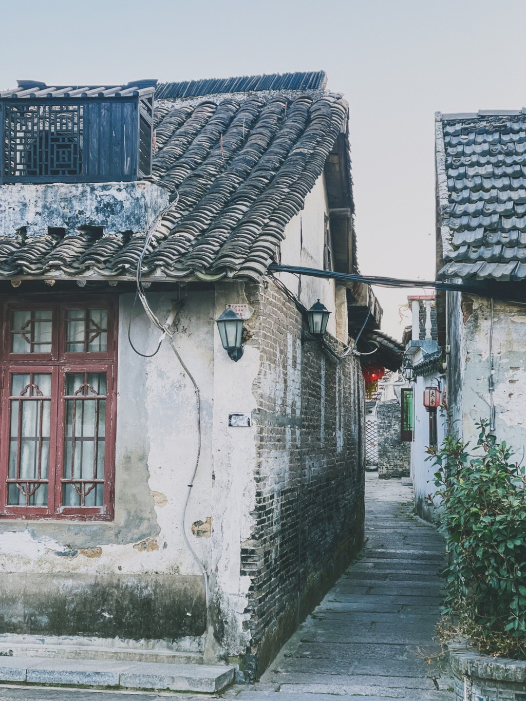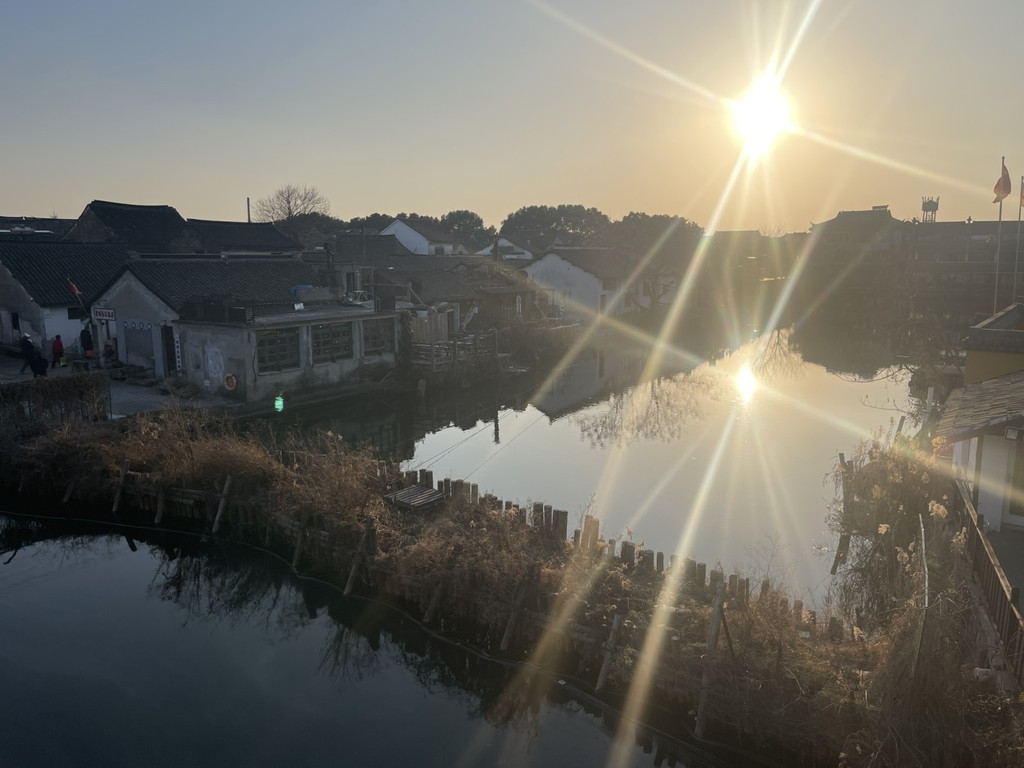 到达西塘古镇的其中一个游客出入口附近,按预订好的沈园精品民宿管家的提醒,给那附近停车场老板打电话,顺利停车,紧接着服务我们的管家小伙子就来停车场接我们入景区啦。那个入口进去的一条路相对人流量少,房子外观也比较陈旧,进出口进去就是一座桥,刚好可以看到落日。
