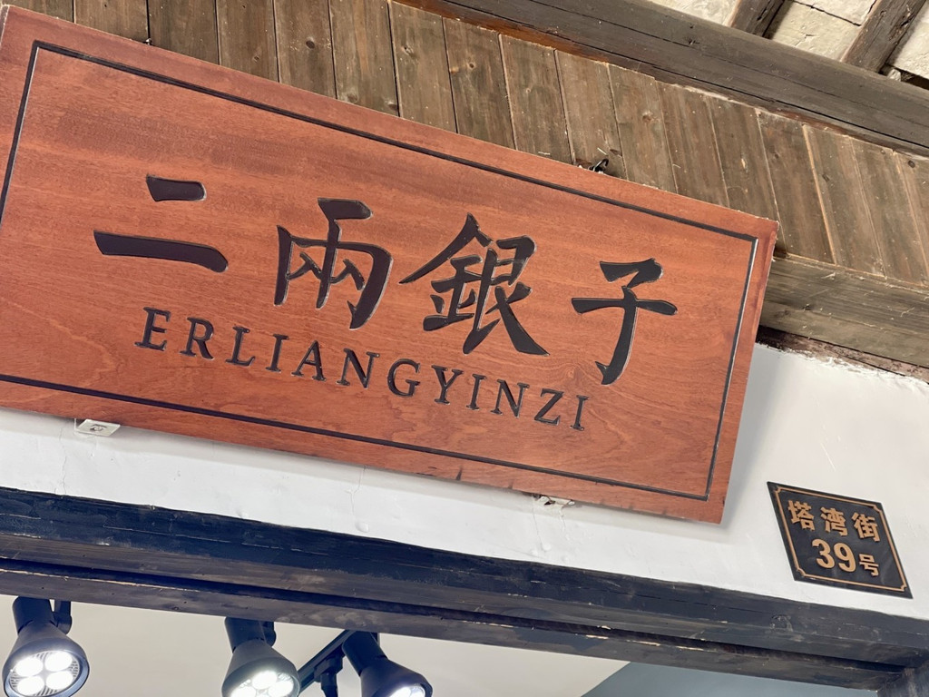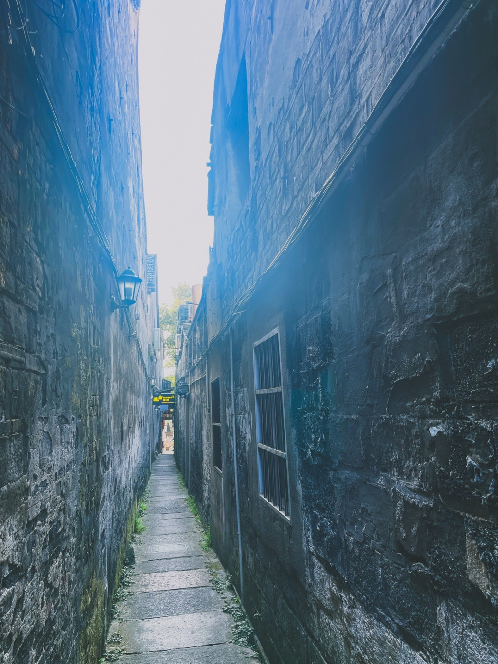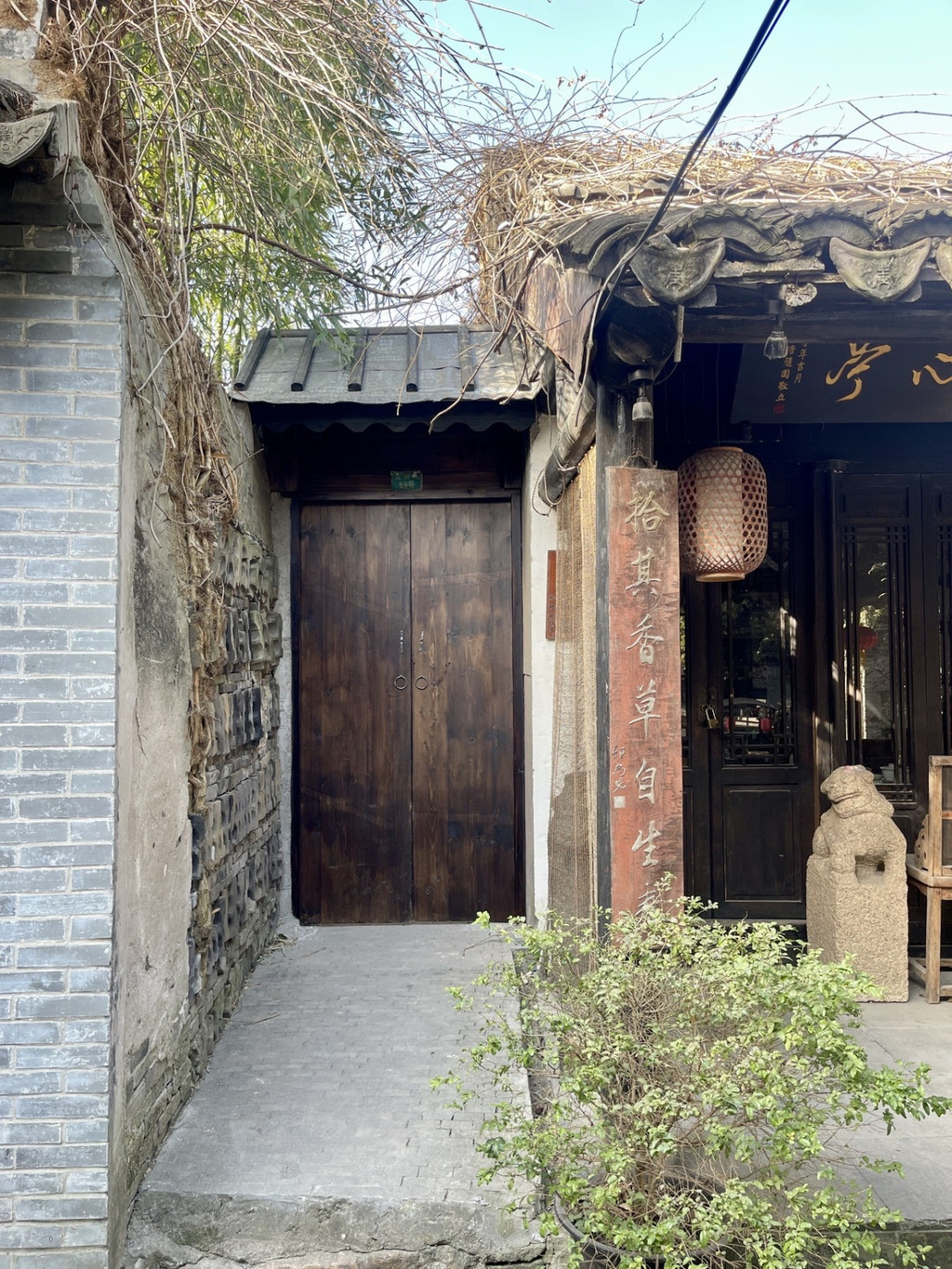 过了桥的这条路很安静~这个饭店名也是应景了电视剧。穿过上图的巷子进入,先到我的房间,是个复式的设计,门口就很有感觉哪。房间对面出去就是一条通往河边的巷子,巷子口刚好是瑞幸咖啡的店铺,从安静走到人气的古镇啦。