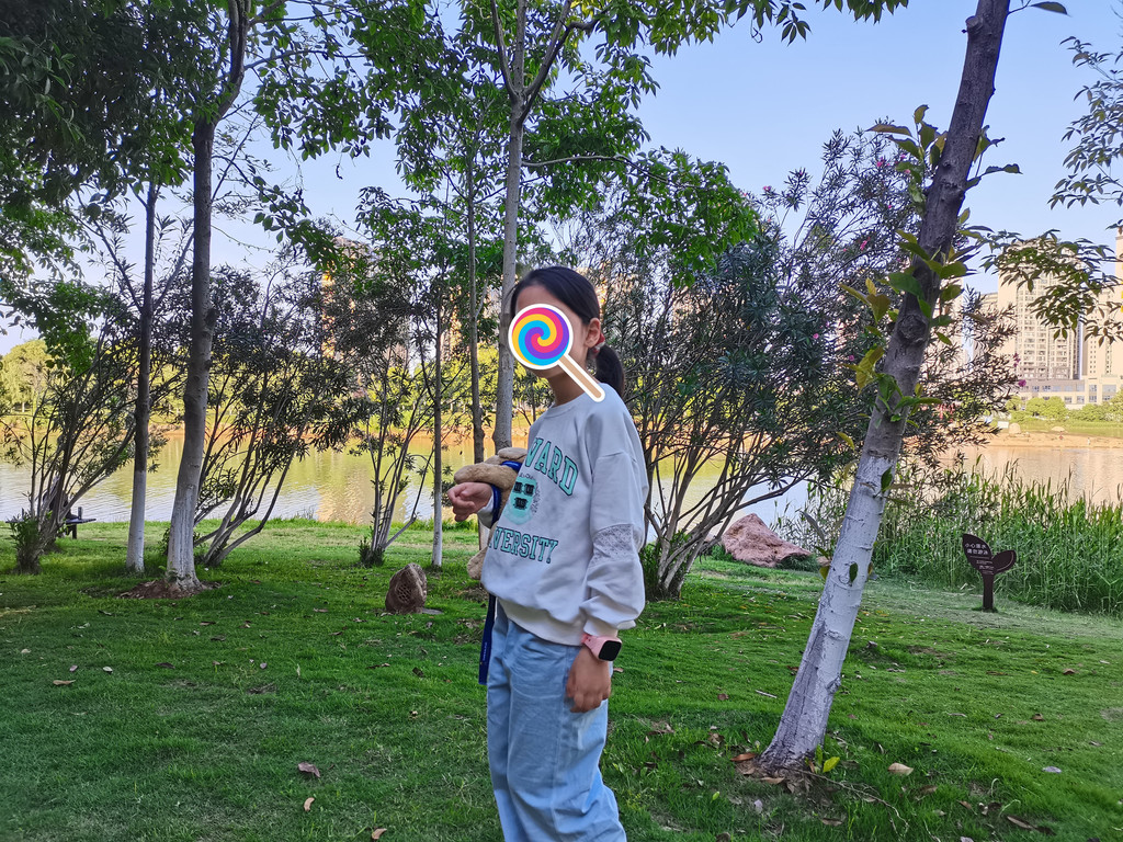 二乔公园一角,绿意盎然,牛小妹与棒棒糖的合影!