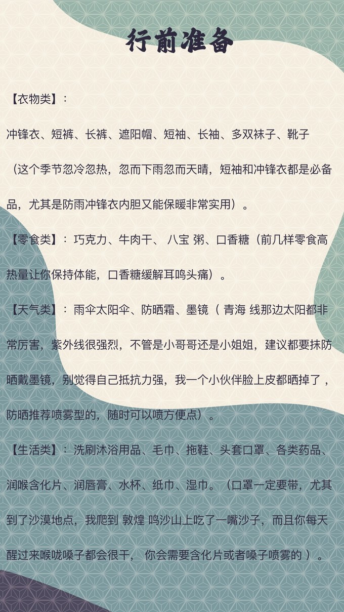 最好提前一个月从网上定好酒店、租车、机票火车票这些,这样价格会低些,而且不会找不到地方住;莫高窟门票也是要提前从官网订的,否则要排队很长时间买应急票而且不一定能买到;要注意尊重当地人的信仰及风俗习惯。