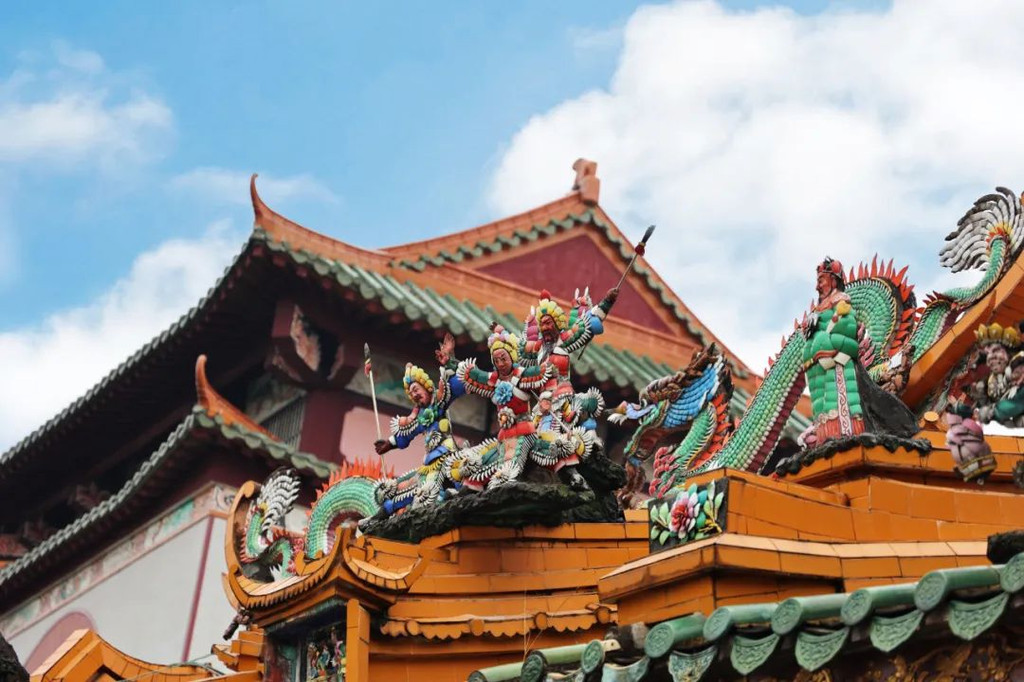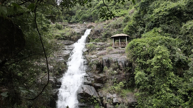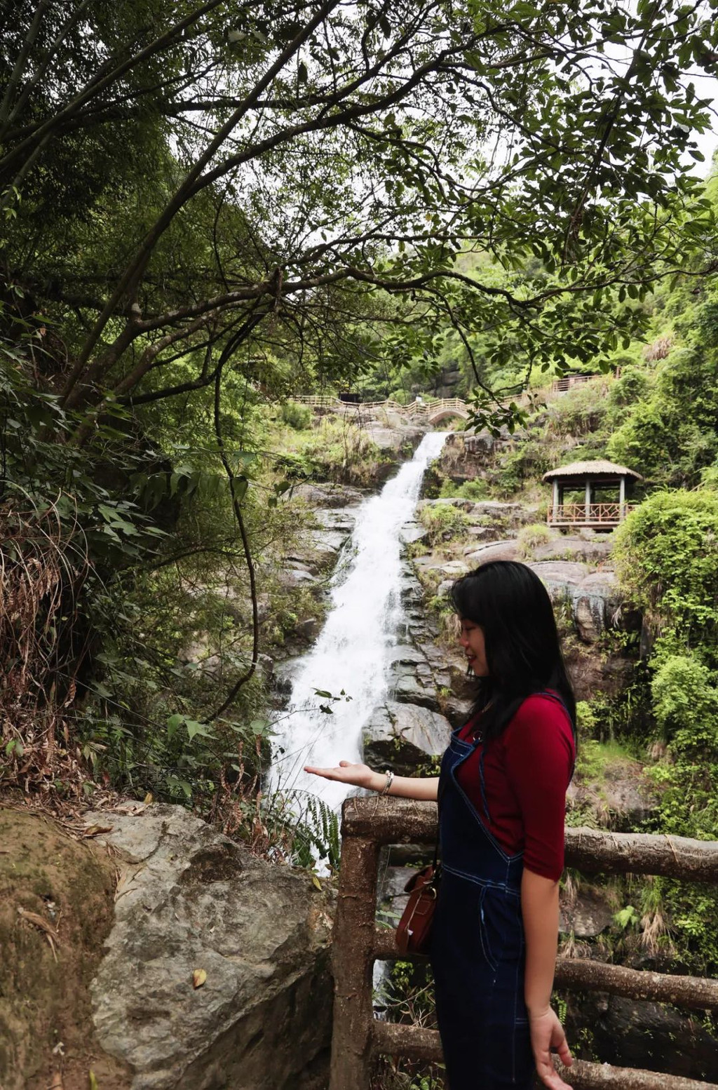 旋律很棒,不过不太听得懂,但这一幕相信大家都不会陌生吧,这是《梁山伯与祝英台》是中国汉族民间四大爱情故事之一,选段中演绎的是祝英台女扮男装在求学路上偶遇梁山伯,一见倾心,两人在草桥边上结拜兄弟的唯美剧情。听完以后还可以和小仙女一起合影呢!好开心!【“岭南第一瀑”黄满寨瀑布】黄满寨瀑布其实是黄满磜瀑布群,不过磜字有点难打,久而久之约定俗称为黄满寨瀑布,定位也是,它位于揭阳市揭西县京溪园粗坑村粗坑河上游,河水至此奔流直泻,形成宽八十米,落差近百米的天然瀑布。享有“岭南第一瀑”的美誉。黄满寨的风景是无限瑰丽的,尤其带着小朋友的家庭,是真的能实现一家人游山玩水活动。尤其到了4-5月,黄满寨民俗村内荷花竞相开放,是赏荷的好去处。而且在山里,总是能随处可见到满山的李子在树上结果,很多成熟的掉落在地上,走过都会闻到一股发酵李子的香味,很心旷神怡哦。总共有5层,珊珊这一次来,爬到第二层:【第五级:斗方崆瀑布】“斗方崆瀑布”是黄满寨瀑布群自上而下的第五级瀑布,从侧看似万颗珍珠倒在斗里,流入碧绿的“棺财潭”中,由此得名。她们说,经过棺财潭,升官又发财;【第四级:三叠谷瀑布】这由三个落差6-8米高的瀑布组成,三个瀑布错角相连,一波三折,摇曳多姿,水声之大几乎隔山可闻。是个观瀑、看树、赏藤、亲水的好去处。【第三级:落九天瀑布】第三级:落九天瀑布,这是瀑布群中落差最高的瀑布。它似银河倒泻、巨练悬天,落差高达120多米,可与庐山瀑布比雌雄。【第二级:银河崆瀑布】景区内负氧离子最高的地方,据监测达到每立方米10万个负氧离子。 太舒服了,我在这里坐了好久!因为坐太久了,一直坐到工作人员要我们小山才发现,唉,还有最上一级飞虹瀑布,唯有下一次咯……【永昌古庙】潮汕多善男信女,而在潮汕这边,有着很多很有历史的古庙,这次来揭西,就去了两个超级有名气的古庙:永昌古庙云湖庵位于棉湖镇南门居委北爷门,是棉湖最古老的庙宇,始建于南宋,明代洪武年间及清乾隆、嘉庆、光绪年间曾重修,主建构为清代嘉庆十年(1805)所建。