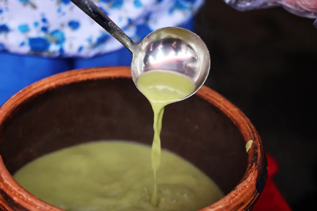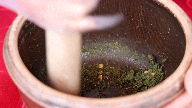 【河婆擂茶】是具有客家特色的传统食品。先把茶叶、花生、芝麻等放在擂缸里擂成酱,加少许食盐(亦可加糖),后将沸水冲进缸里, 即成擂茶。