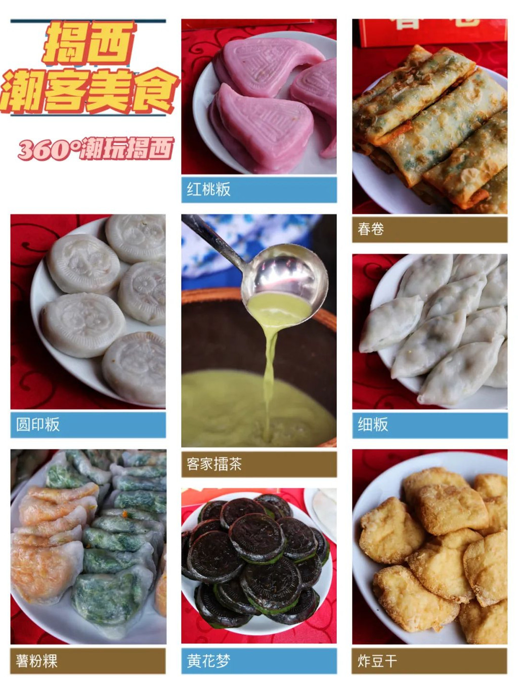 这个周末,珊珊和一班小伙伴,来到了揭西,参加一场4天3夜的旅行,走过当地最美的景点,吃尽当地的美食。【360°潮玩揭西】最美人间四月天,4月25日,在这个春意盎然的美好日子里,由揭西县文化广电旅游体育局联合南方卫视主办,樱山花谷景区、大鹿农业公园、黄满寨瀑布旅游区、京明温泉度假区、大洋国际生态旅游度假区协办,“360°潮玩揭西”活动启动仪式在樱山花谷景区隆重举办。举办“360°潮玩揭西”活动,是揭西县文广旅体局大力打造文旅品牌、努力争创国家全域旅游示范区的重要举措。本次活动在启动前期,举办方以揭西全域旅游资源为元素,通过电视、网络媒体向全社会发出征集令,展开一场揭西全域旅游攻略大搜索,征集“360°潮玩揭西”N种方式,得到了广大民众的积极响应,同时发动了一批网络大咖参与活动,评选出“潮玩揭西十大攻略”。这是一场“揭西全域旅游”媒体推介盛会。活动以完全互动方式发动社会参与,收集揭西的绿色生态、乡村休闲、康养度假、红色文化、古镇古村、节庆活动、美食特产等各类潮玩方式与休闲空间,同步开展乡村旅游精品线路推介和潮客美食展示活动,梳理揭西全域旅游创建成果,全面展现揭西文旅风采。【揭西美食大搜罗】在现场,除了有旅游线路的推荐以外,最吸引珊珊的,莫过于就是揭西潮客美食展示。去一个城市,最让我着迷的莫过于美食,特产,美景,来到揭西,让我震惊的就是这里的潮客美食,琳琅满目的当地美食,全部都是用当地的食材做的,细粄,春卷,红桃粄,圆印粄,黄花梦,珊珊总结出来的就是当地人对原材料的做法发挥到淋漓尽致了,不仅仅是馅料有所不同,用到的皮馅都是用不同材料做的,现场吃的都很好吃,听说还有很多的养生效果哦,珊珊勉强记住了几款很特别的:【红桃粄】听当地人说,这是用大米糯米做的点心,里面是香菇虾米肉馅的,红色代表吉祥,所以当地人每逢家里有好事都会做这个点心来招待客人。【炸豆干】其实就是潮式豆干,刚炸出来的豆腐外酥里嫩,点上专用的盐水酱汁,珊珊一不小心就吃了好几块。【薯粉粿】薯粉粿是属潮州菜,外皮晶莹剔透,冷吃或油煎均可,冷吃凉喉润滑;可以做成不同形态,煎熟也可以哦……【春卷】这是当地特有的美食,比广式春卷要大很多,而且一定要现吃,热辣辣,脆卜卜的春卷,里面的韭菜馅特别香;【黄花梦】:我一开始以为是艾糍,没想到原来不是,其实它是潮客当地一种流行的潮客美食:“鼠曲粿”。是当地一种叫黄花梦的植物结合糯米一起做的,在清明前后吃,还有一定的保健作用呢……【细粄】:这道相信经常吃客家菜的朋友们一定不会陌生了,原来这道是揭西这里的特产哦,用粘米粉加入馅料蒸熟,吃起来爽口顺滑,很好吃哦……