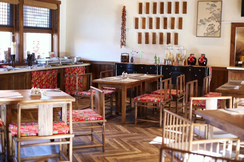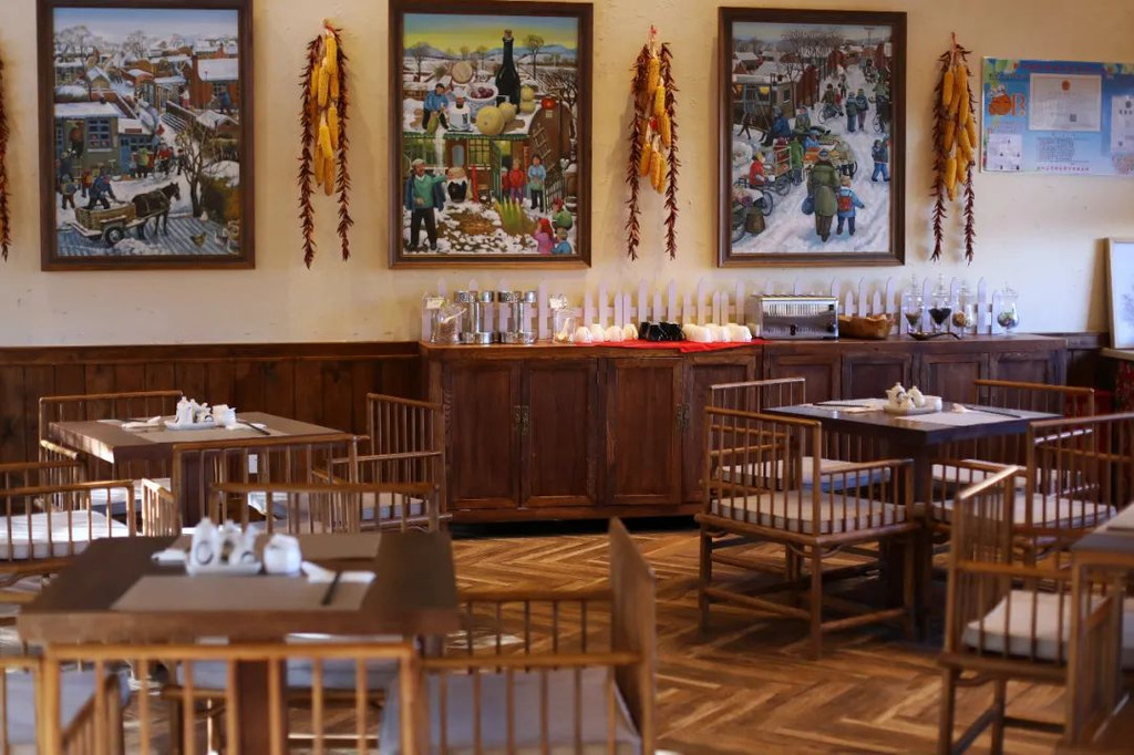 长白山鲁能胜地原乡客栈的餐厅很有感觉,墙上挂着年画,辣椒、玉米。