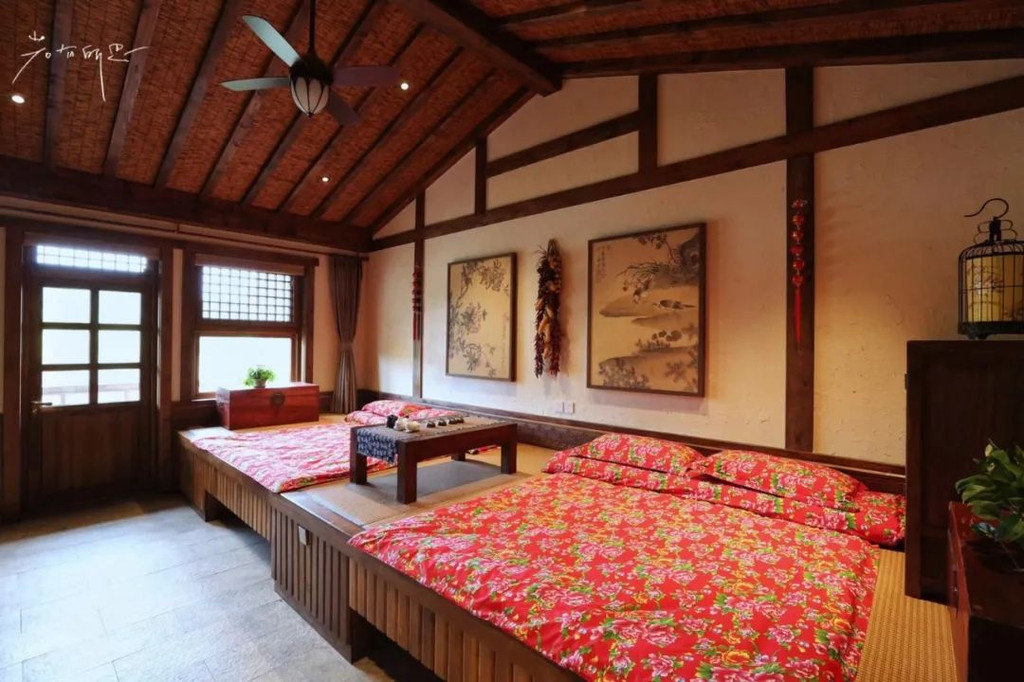 墙上的年画,窗户上的窗花,都红红火火。房间有地暖,睡觉的炕也可以自由调节温度。床品都是一客一换,在感受东北风情的同时,也非常舒适。