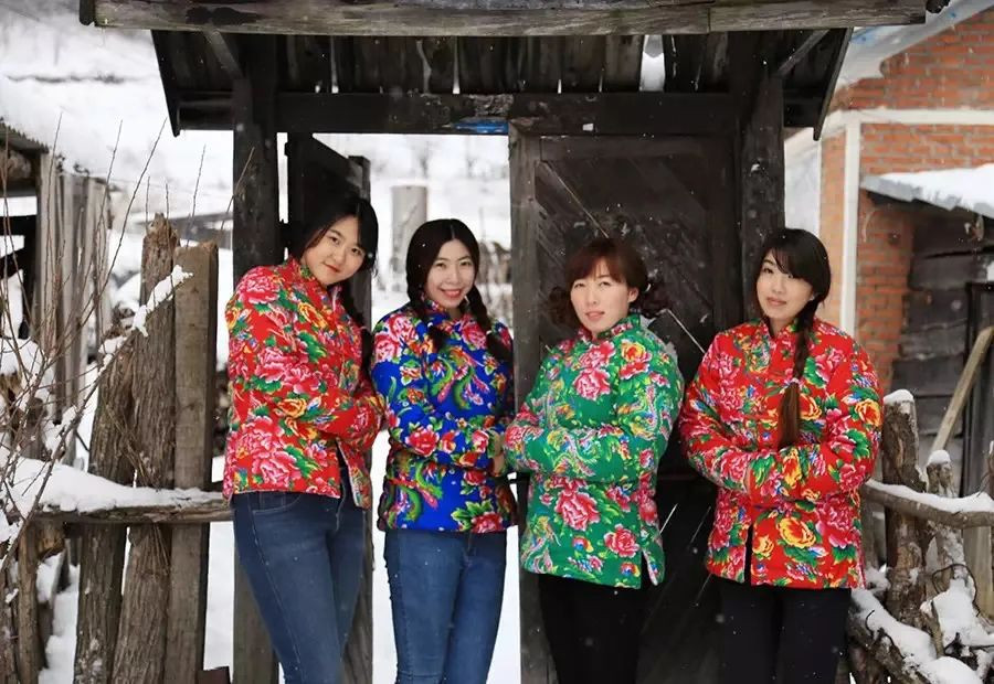 2015年的冬天,我第一次到东北旅行,和几个朋友换上了大花棉袄,站在雪地里拍了张照片。