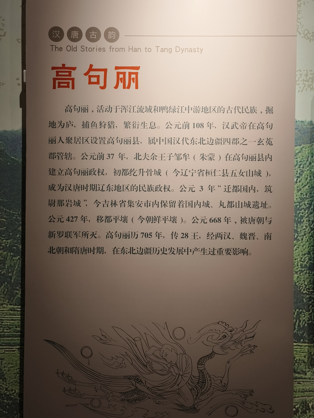 “汉唐古韵”单元展示汉唐时期吉林省的历史。约公元前37年,扶余王子朱蒙建立高句丽国,鼎盛时期曾控制朝鲜半岛大部和中国东北的南部地区,乾封二年(668)被唐高宗攻灭。698年,靺鞨部落在吉林敦化建国,向唐称臣纳贡,被册封为“渤海国王”,926年被契丹所灭。