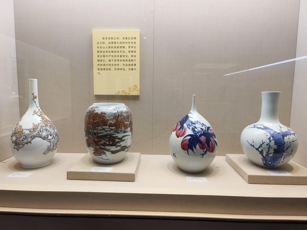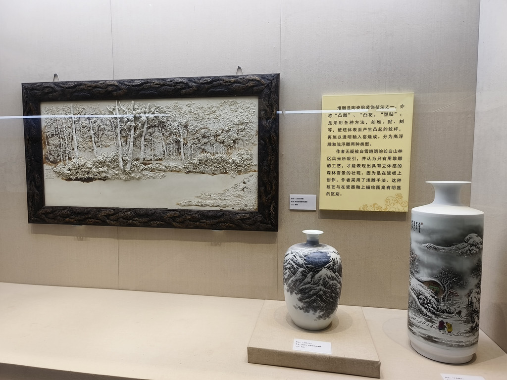 瓷彩华章——吉林省陶瓷艺术馆主题陈列,从“钟灵毓秀”、“古韵拾珠”、“物华天宝”、“瓷苑掇英”4个方面,展出景德镇陶艺师以吉林区域文化为灵感制作的瓷器作品146件(套),展现了景德镇的陶艺工艺水平,以及吉林自然风光、历史文化、民俗民情、名人风采。