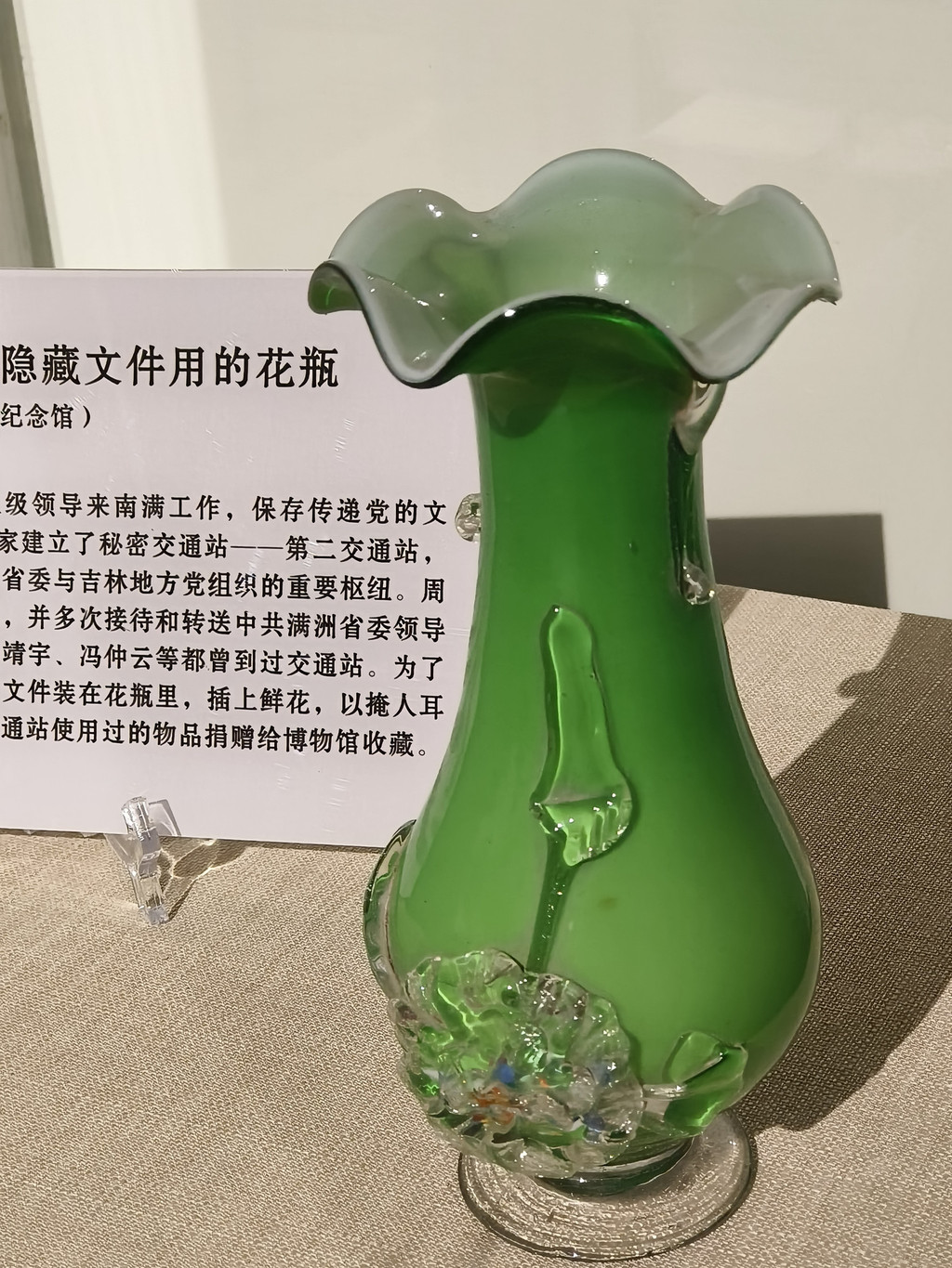 ↗中共吉林特支第二交通站隐藏文件使用的花瓶,国家一级文物。1933年初,中共吉林特支在吉林市河南街建立秘密交通站,周建华任站长,妻子闫庆莲为工作人员,他们曾将党的文件和传单藏在花瓶中。1963年捐给吉博。