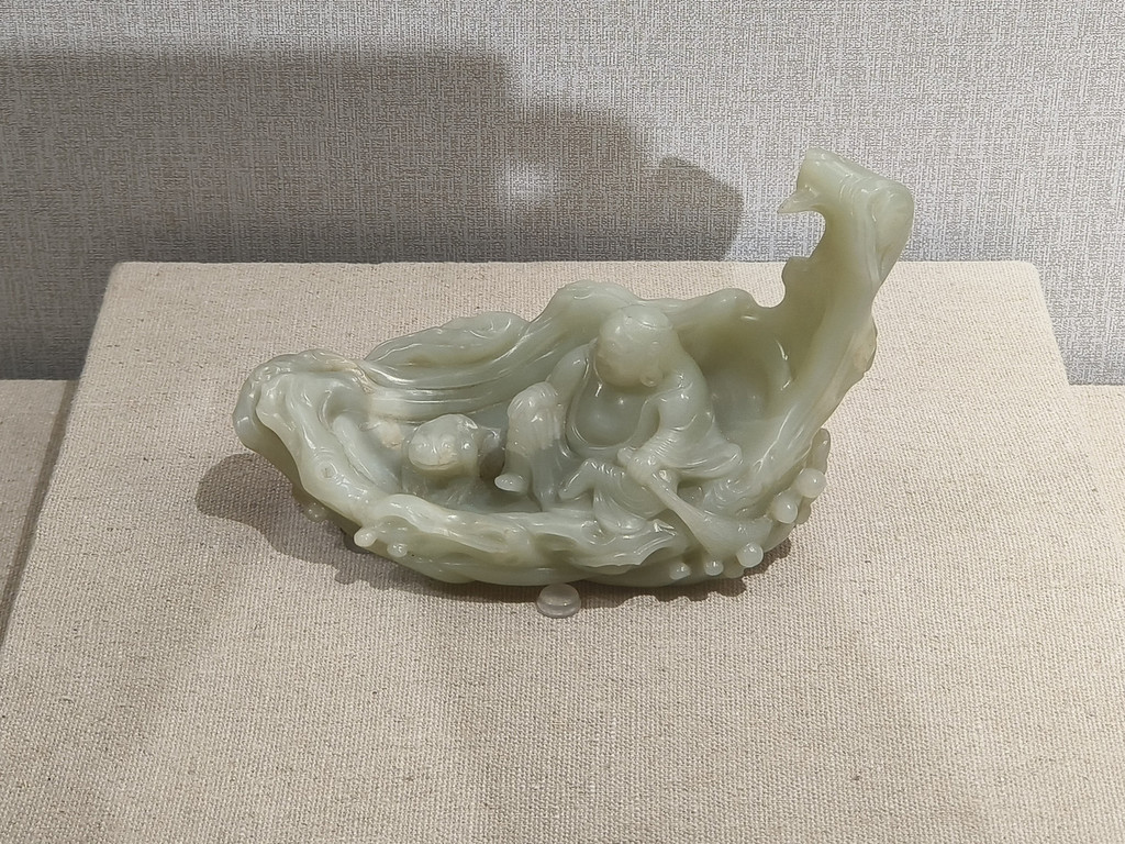 ↗雕刻刘海乘槎白玉摆件。槎(chá)木筏。刘海是道教神仙,本名刘操,五代燕王刘守光的丞相,后遇正阳子点化,辞官寻道,再遇吕纯阳授以丹道,度为神仙。民间奉为准财神,有“刘海戏金蟾,步步钓金钱”之说。