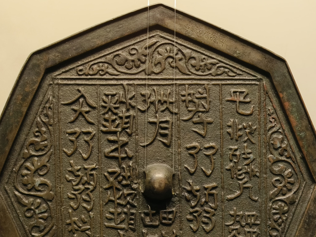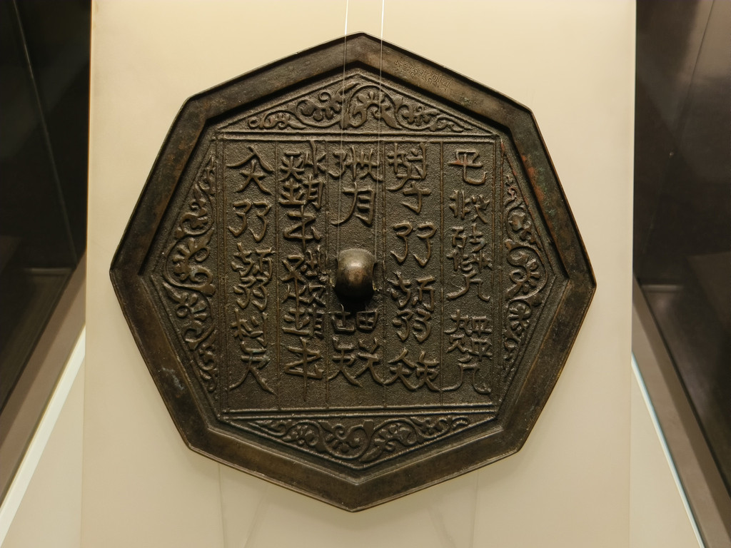 ↗契丹文八角铜镜(辽),镇馆之宝之一。铜镜呈八角形,直径26厘米,厚0.9厘米,镜背中央半球形钮高1.4厘米。钮的周围有五行契丹文铭文,分布在正方形框内,框的上下左右分别有对称的两组花纹。铭文大意为“時不再來,命数由天;逝矣年华,红颜白发,脱超网尘,天相吉人。”感叹人生的短暂和对美好事物的眷恋。铜镜右上角刻有边款“济州录事完颜通”七个汉字。这是目前我国仅有的几面契丹文铜镜中镜面最大、文字最多的一面,对于研究辽代契丹族的文化和社会思想等具有重要价值,属于国宝级文物。