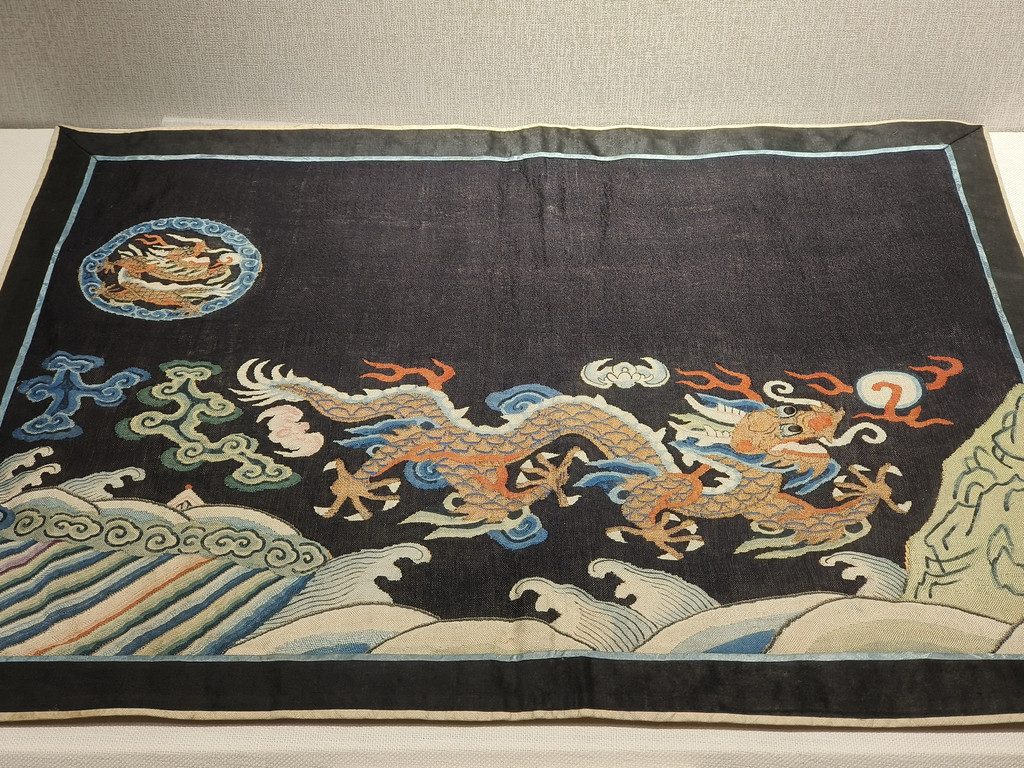 ↗缂丝海水云龙桌面。缂(kè)丝,又称“刻丝”,是一种以生蚕丝为经线,彩色熟丝为纬线,采用通经回纬工艺方法织成的平纹织物。因织造过程繁琐耗时、极其细致,“承空观之如雕镂之像”,素有“一寸缂丝一寸金”、“织中之圣”的盛名。