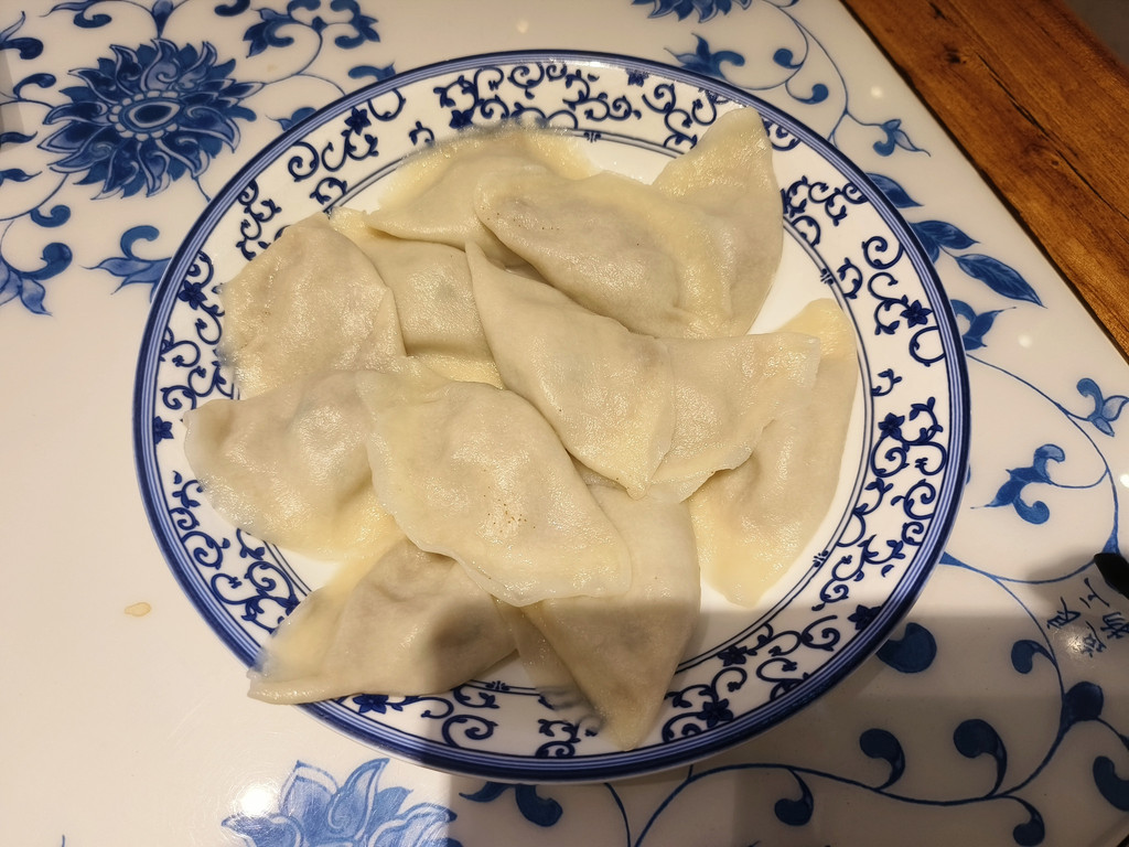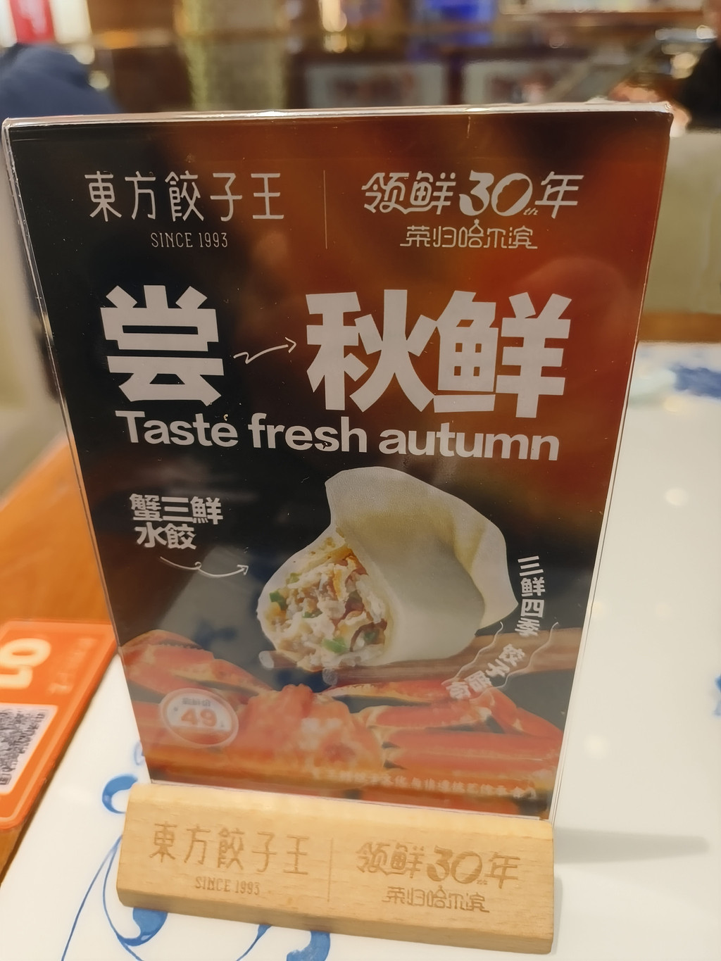 三鲜饺子是该店的招牌菜,普通馅料的价格实惠,一份十多元。“秋三鲜”等时令馅料的稍贵,我点的蟹三鲜49元,还有一种松茸三鲜99元。