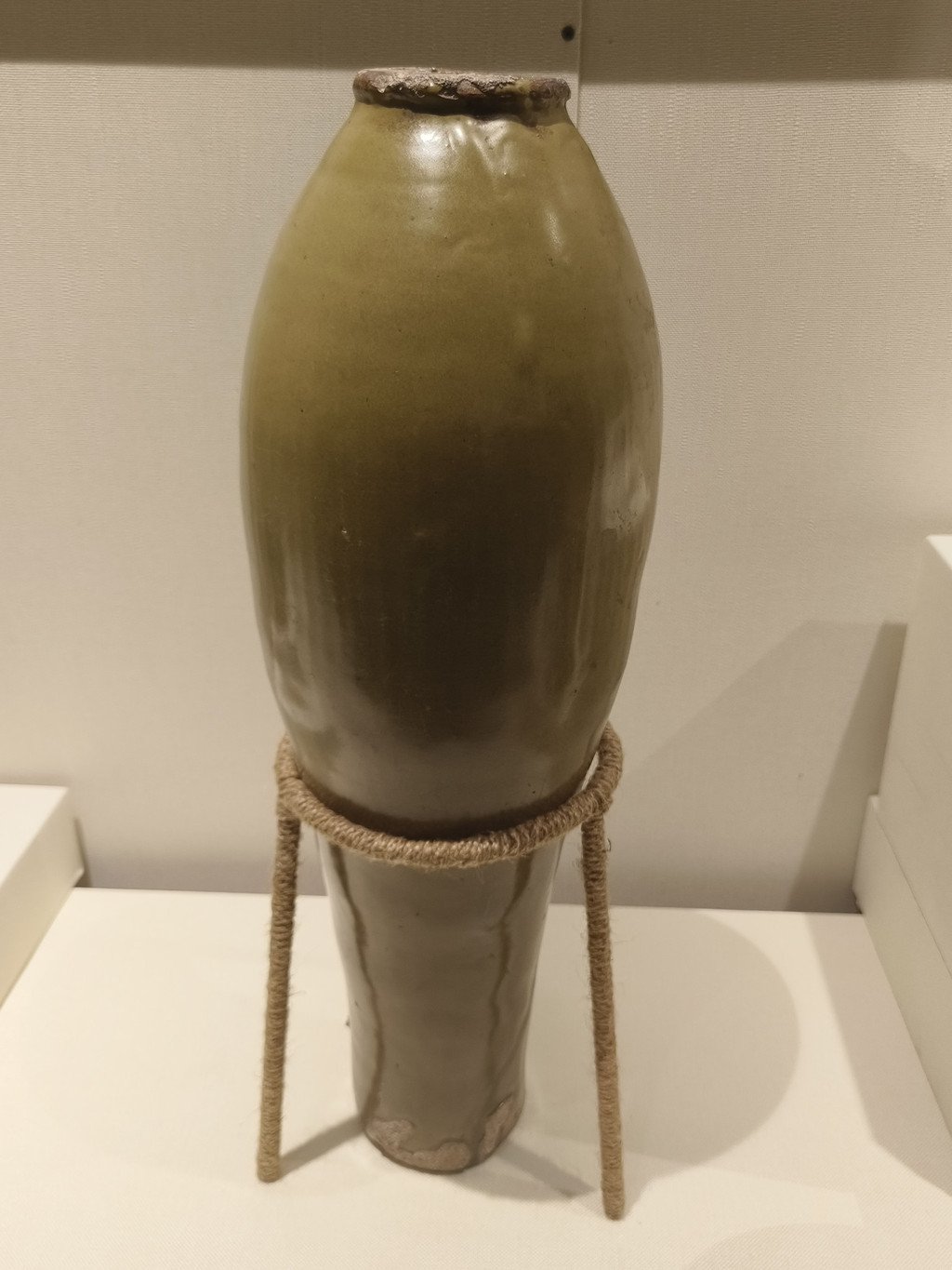 ↗茶叶末釉鸡腿瓶(辽)。鸡腿瓶由契丹人发明,胫部近似楔形(倒梯形),口部为短颈的翻卷形式,修长的瓶身适合运输和储存,小口装水不易外洒,长腹硕肩盛水较多。茶叶末釉属高温黄釉,灰绿如茶叶,故名。