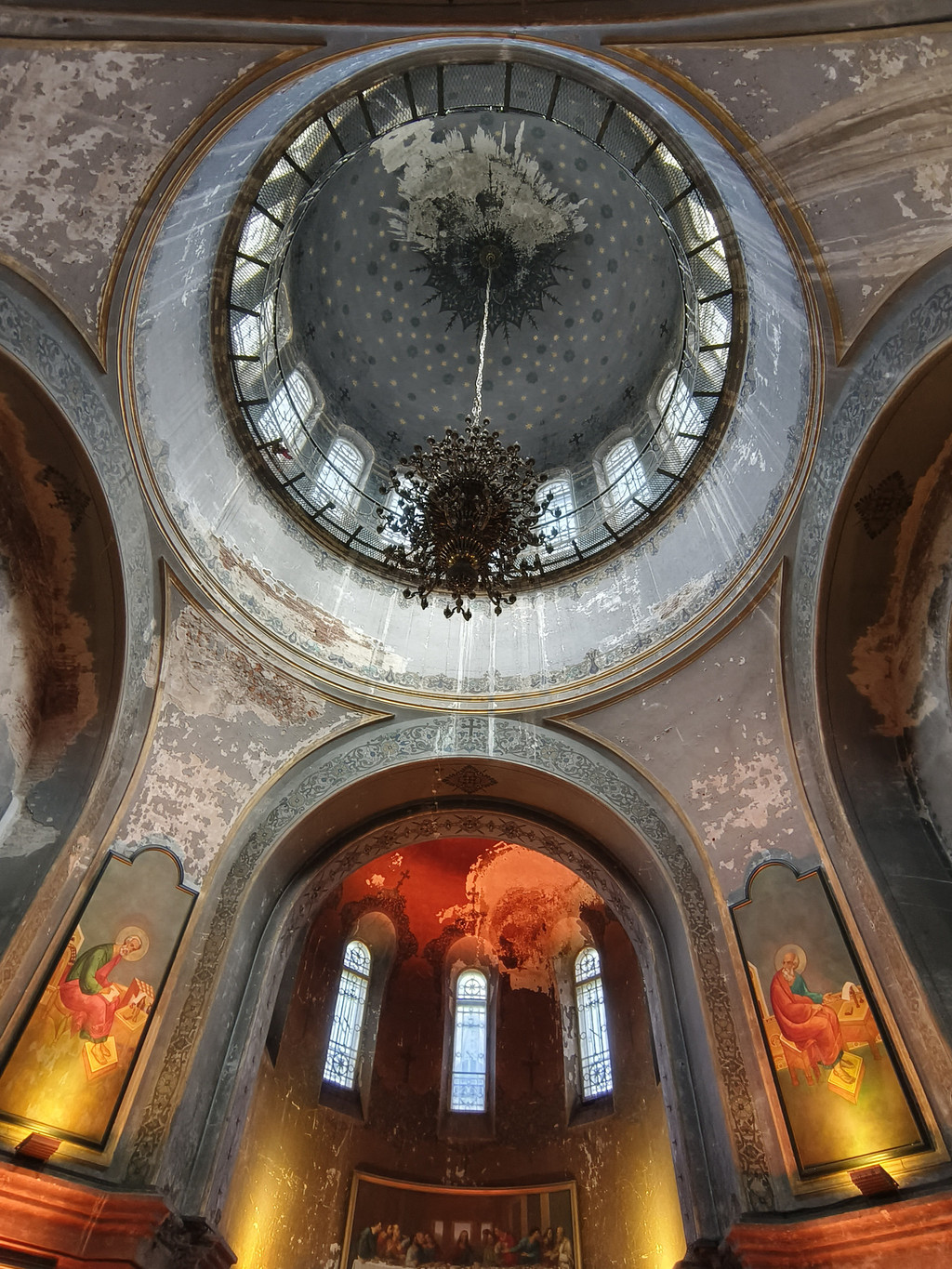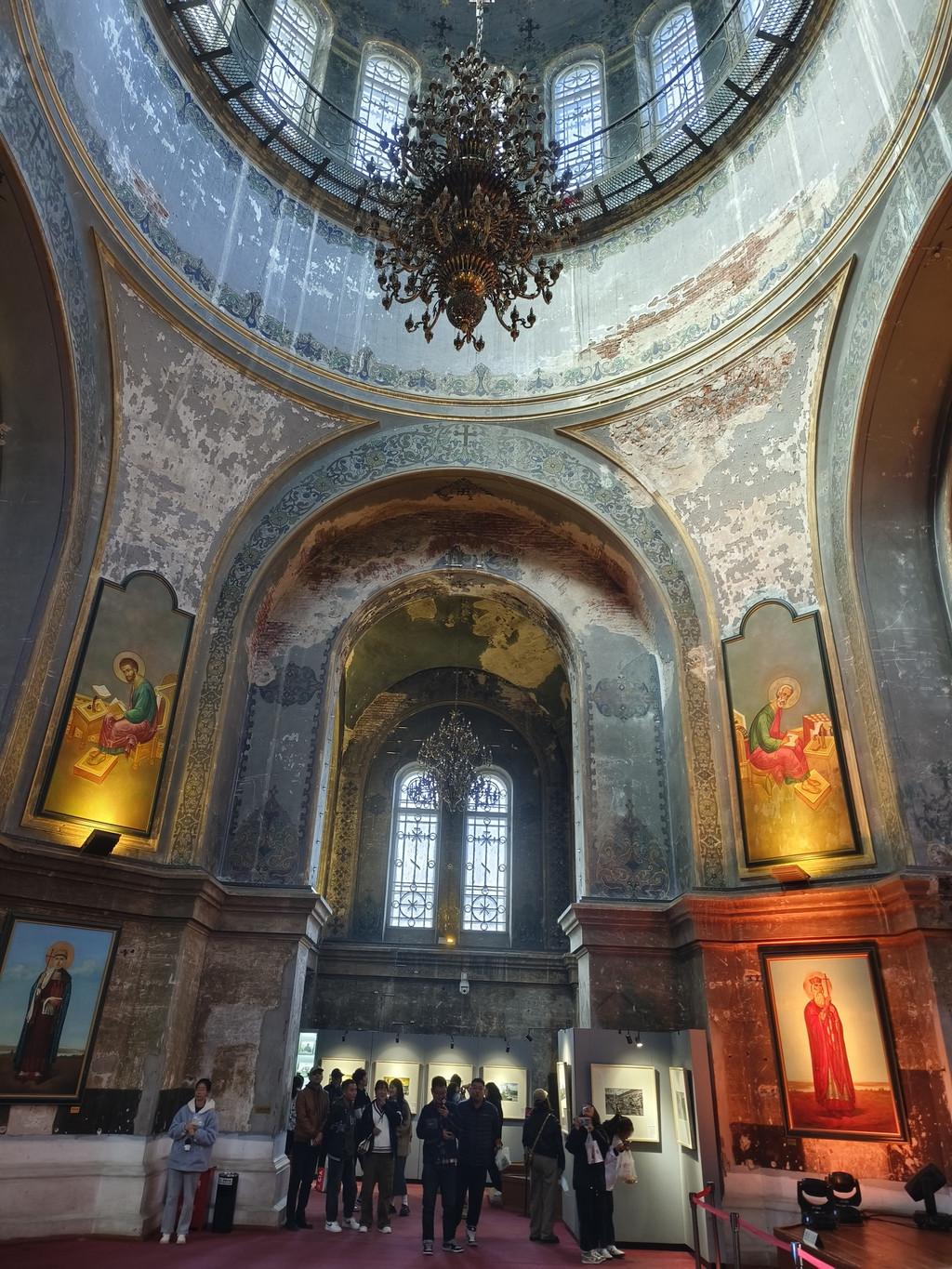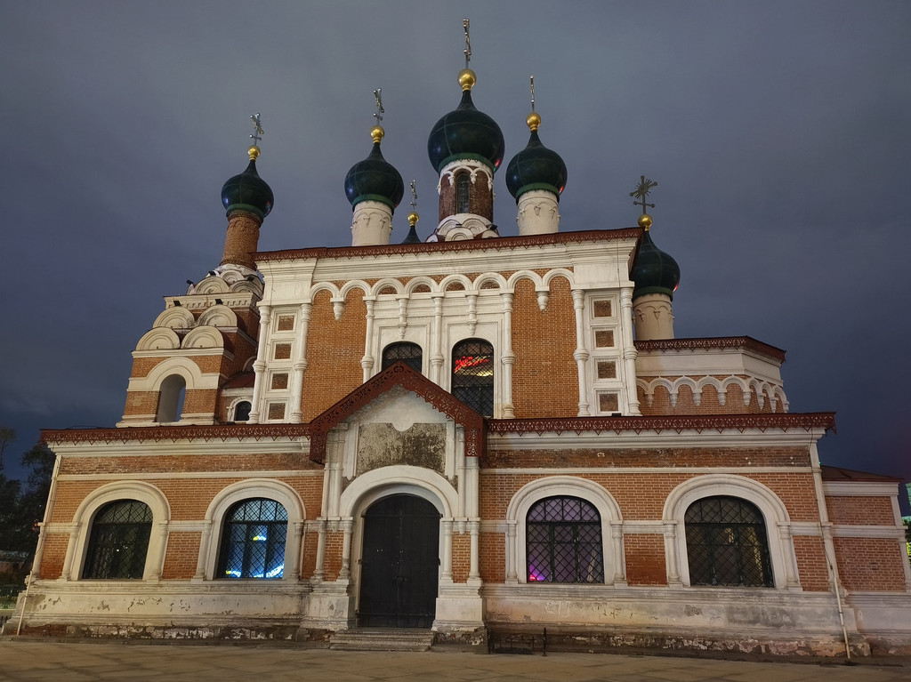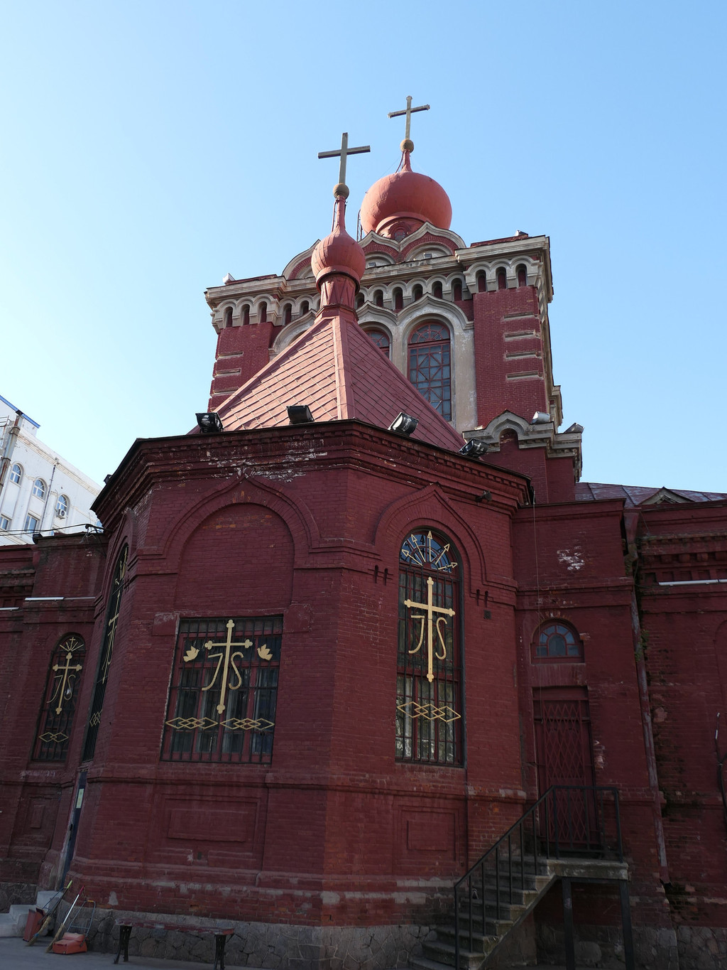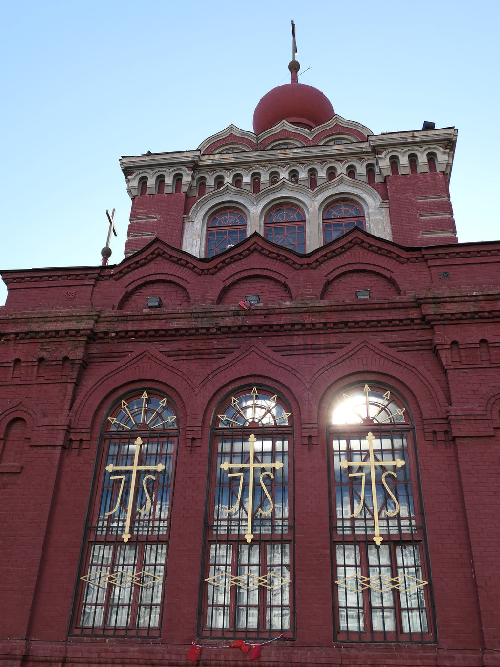 现在是上午9点,从光照方向可以看出,教堂正门朝西。东正教教堂几乎总是东西向的,象征礼拜者从罪恶的黑暗中(西方)进入真理的光明中(东方)。窗户上的字母JS是拉丁文Jesus hominum Salvator的缩写,意为“耶稣是人类救主”。教堂名称前的“圣”,意思是“神圣的”、“像上帝一样圣洁”,表示一种尊重和纪念。