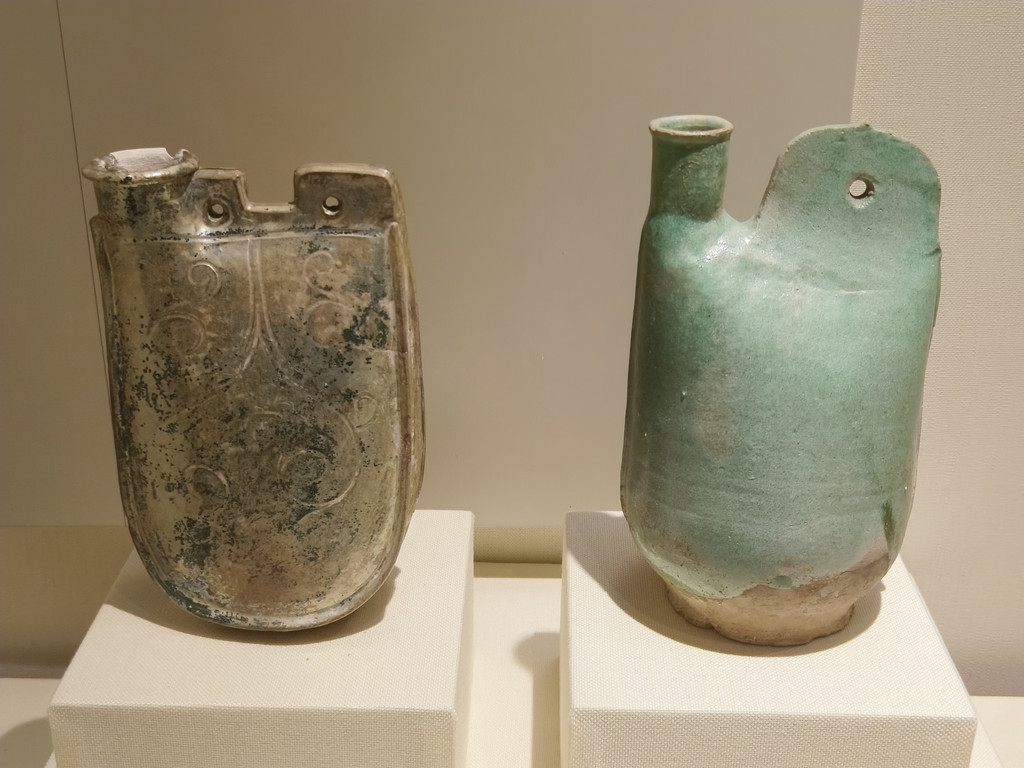 ↗银釉鸡冠壶、绿釉鸡冠壶(辽)。左边的银釉鸡冠壶为淡黄陶胎,扁身,短管口,上面有双孔供穿绳用。整体呈光艳悦目的银斑,纹饰简洁明快,造型优美自然。右边的绿釉鸡冠壶造型相似,孔为单孔。鸡冠壶是辽瓷中的典型器物,适应游猎生活需要,具有浓郁的民族风格。