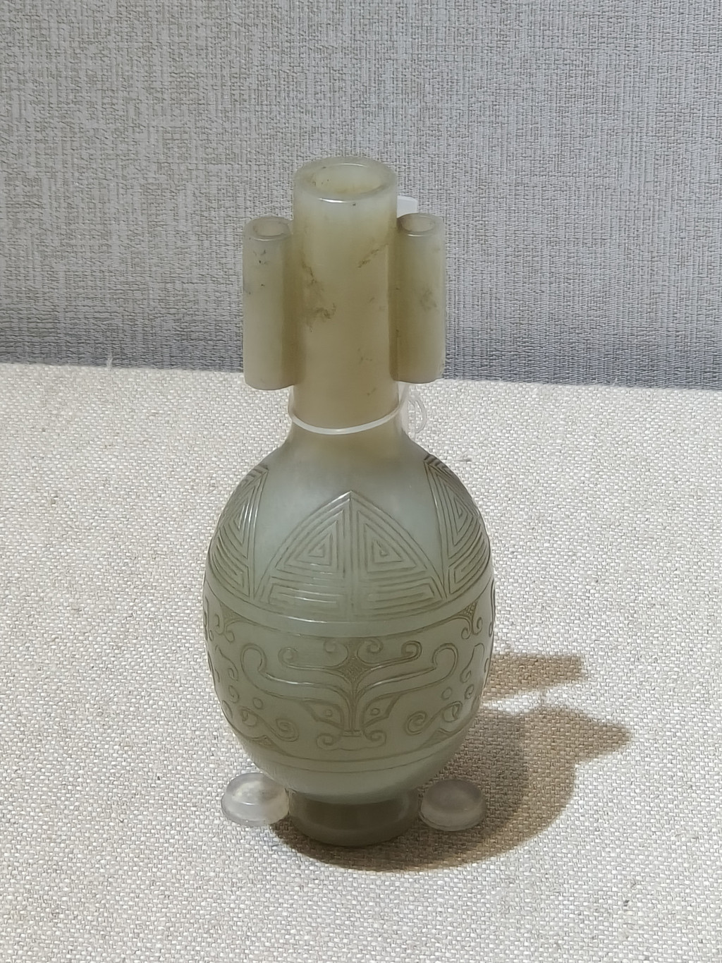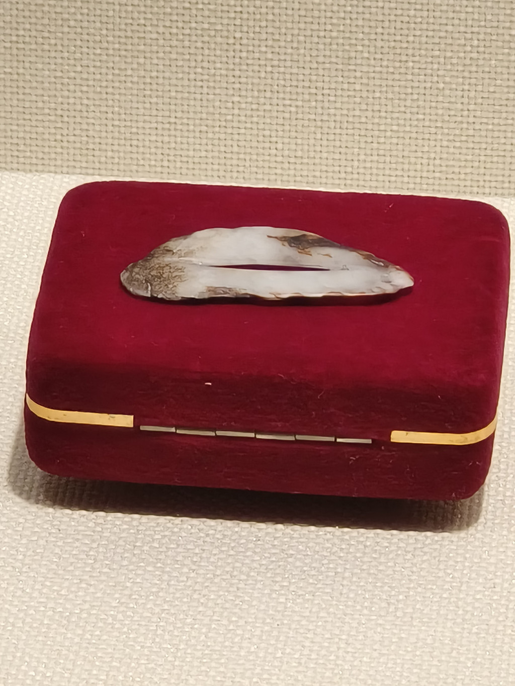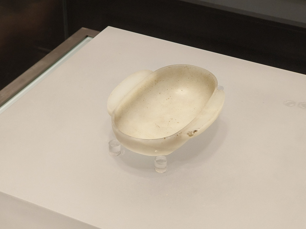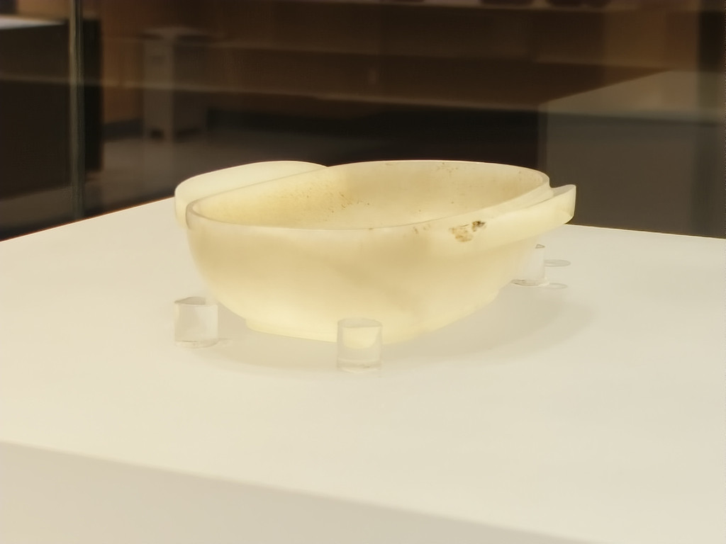 ↗白玉耳杯(高句丽)。耳杯也称“羽觞”,用于盛酒或羹,多为漆器,也有陶质的,玉制耳杯为数甚少。此耳杯玉质光润晶莹,富丽端庄,系新疆和田玉磨制而成。其形制与满城汉墓出土的料耳杯相似,当为汉代畿内工匠的杰作。可能是中央王朝馈赠之物。