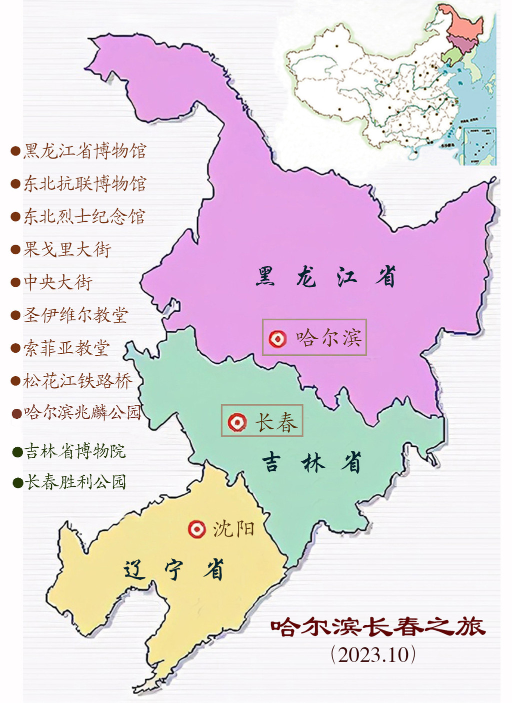 哈尔滨、长春多年前的夏季来过,游览了中央大街、索菲亚教堂、松花江、长春文化广场、世界雕塑公园等地。这次深秋时节故地重游,以参观博物馆为主,属于拾遗补缺。有三点感受:一是早晚温差大,要注意保暖。东北地区10月下旬早晚气温都低于0℃,中午在10℃以上,采用“竹笋穿衣法”比较好,增减服装方便。二是光照时间短,要抓紧游玩。早上6点不到已蒙蒙亮,下午4点半太阳就落山,天色一转暗,效果会打折,影响观光体验。三是不如意常有,要保持平常心。这次吃了两个“闭门羹”,本想到黑龙江邮政博物馆、长春般若寺看看珍贵文物、古刹神韵,谁知到了门口,映入眼帘的是一纸“暂不开放”告示。启程前也做了功课看了攻略,没有哪个平台包括官网明确告知啊。更为遗憾的是,此次旅行临时起意的“意”,很大程度上是冲着龙博的金代铜坐龙、南宋《兰亭序图》卷等国宝级文物而来,但目前只有基本陈列“哈尔滨往事——二十世纪初哈埠社会生活展”,没多大看头,更别提重量级文物了。庆幸的是,上帝关了这扇门,一定会打开一扇窗,在吉林省博物院见识了很多宝贝,如迄今唯一与战国名相蔺相如有关的文物青铜戈、镜面最大文字最多的契丹文八角铜镜、罕见的错金银“丙午神钩”铜带钩、珍贵的高句丽文物白玉耳杯等。看来“失之东隅,收之桑榆”是有道理的。