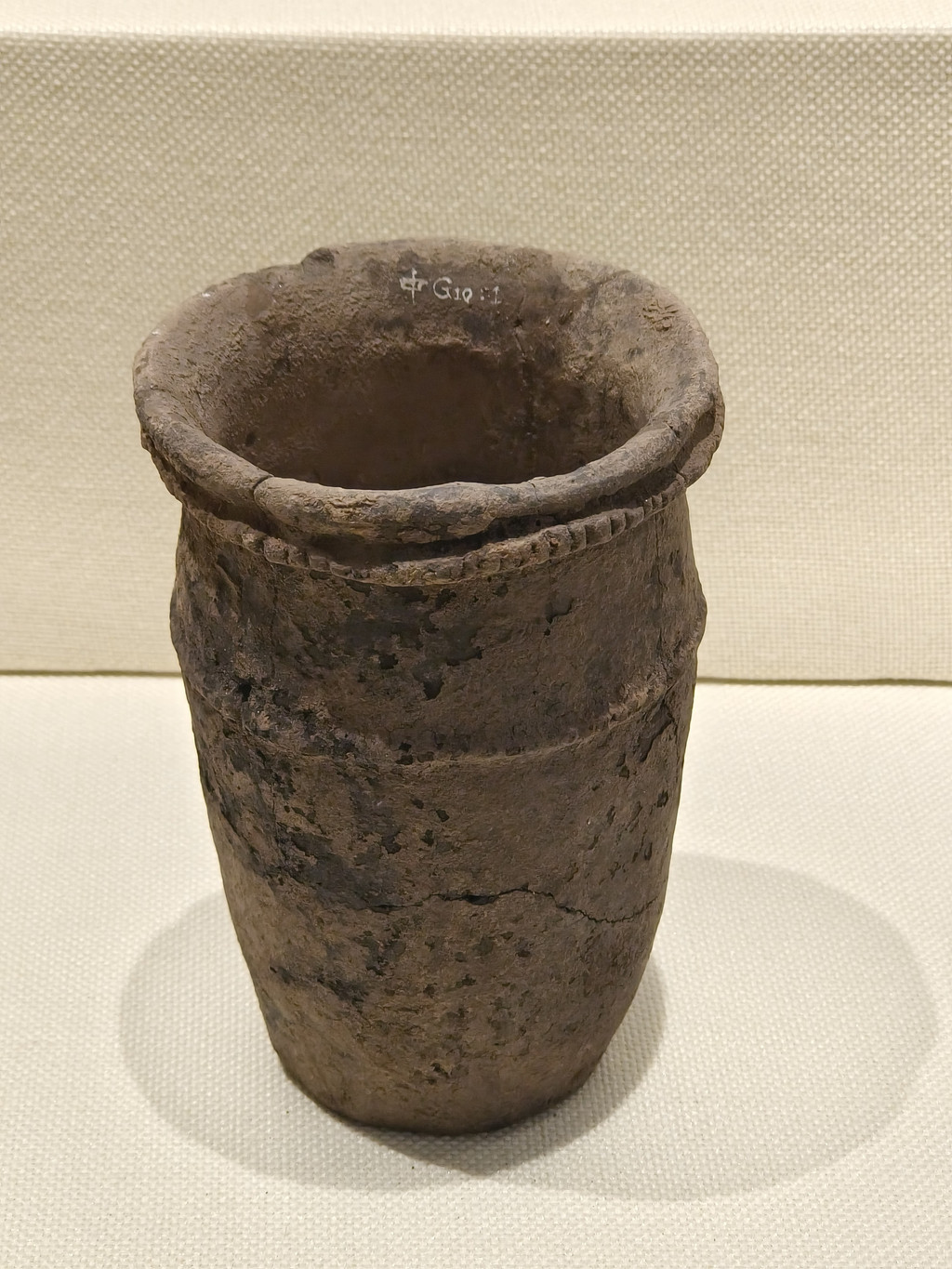 ↗靺鞨罐(渤海)。靺鞨(mò hé)是女真族的祖先,居住在东北地区长白山、松花江、黑龙江一带。靺鞨罐的形制为筒形深腹,口沿下或颈部饰有一圈花边附加堆纹,腹上部饰有四五个篦点为一组的斜线纹。
