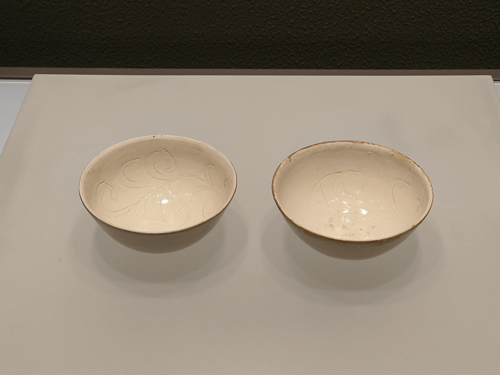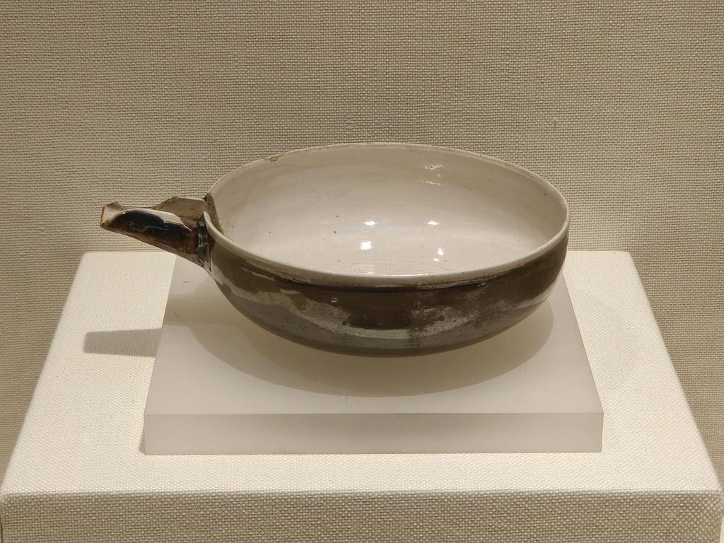 ↗定窑酱釉鱼藻纹瓷匜(金)。器内外两种釉色,外酱内白。内底刻有鲤鱼,侧配水藻,下有水波纹,构成一幅生动的鱼藻图。