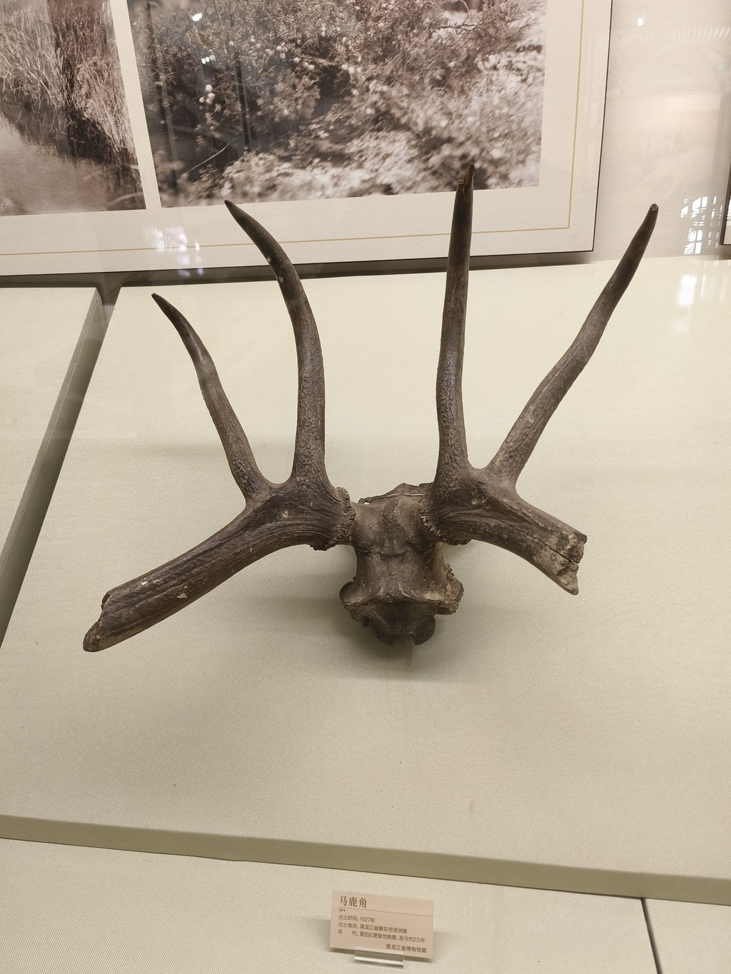 ↗马鹿角(第四纪更新世,距今约2万年)。马鹿是国家重点保护野生动物,分布于新疆、青海、东北三省等地。马鹿角是马鹿已骨化的角,习称梅花鹿角、鹿角脱盘。
