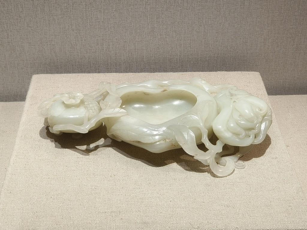 ↗雕桃形青玉洗。一种洗笔工具,由一块白玉雕琢而成。中间为半个桃形,一侧为石榴,另一侧为花,周围枝叶缠绕。