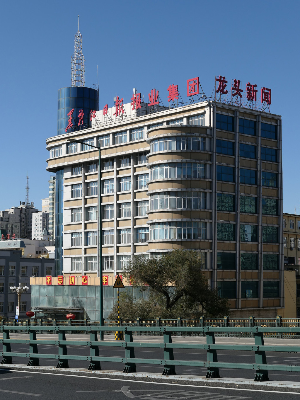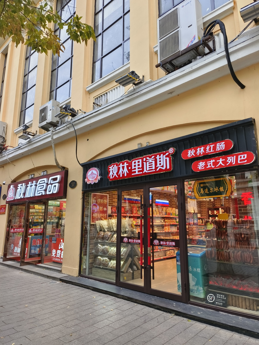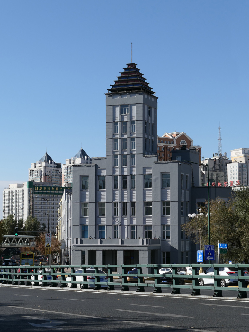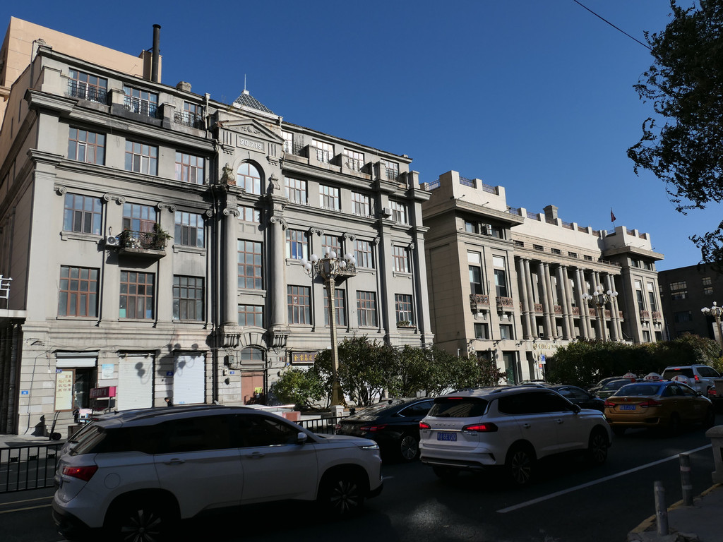 ↗秋林食品公司大楼,位于果戈里大街361号,近东大直街路口,建于1908年。秋林公司由俄国人伊万·雅阔列维奇·秋林1867年创建于俄罗斯伊尔库斯克,1900年在哈尔滨设立分公司,十月革命后总部迁至哈尔滨。1937年由英国汇丰银行接收经营。1941年由日本接管,更名“秋林株式会社”。1945年由苏联政府接管。1953年10月移交中国经营,成立国营秋林公司。1992年3月改组为股份有限公司,1996年3月在上海证券交易所挂牌上市,1998年组建哈尔滨秋林集团,2021年3月被上交所终止上市,面临退市风险。