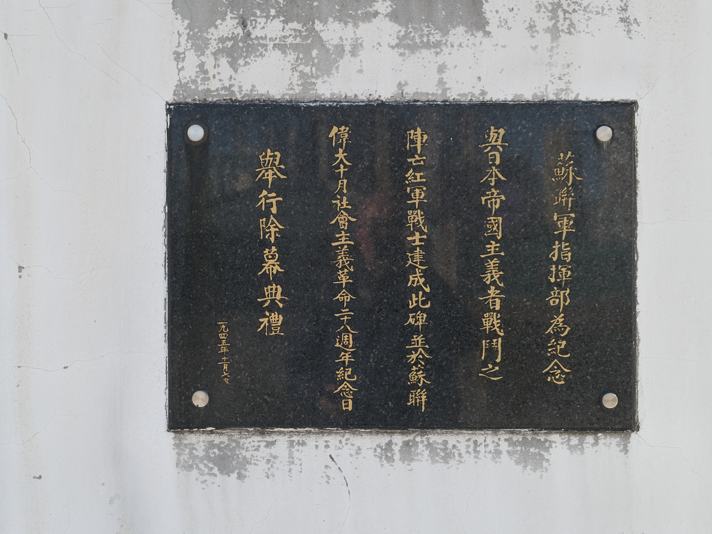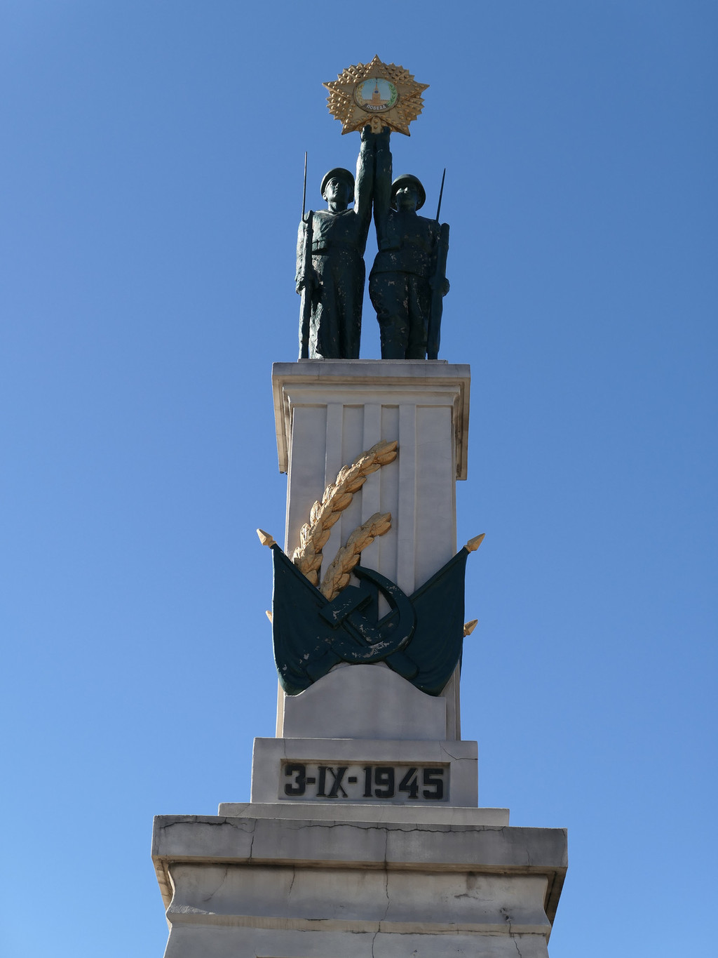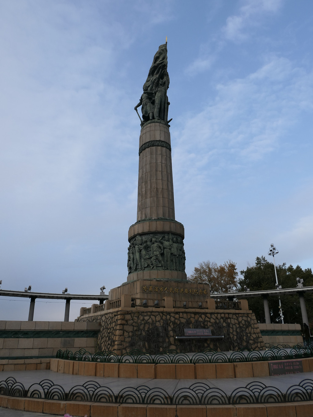 纪念碑高18米,是苏联红军指挥部为纪念在对日本侵略者作战中阵亡的苏军战士而修建,1945年8月动工,同年11月7日竣工。分为基座、底座、主塔、塔身、铜像五部分。铜像高3.5米,由苏联红军水兵和陆军战士两个塑像组成。主塔正反面镶金穗旗帜,塔身四面镶党徽,正面刻俄语碑文:为了苏维埃共和国联盟的自由和独立在战斗中牺牲的英雄永垂不朽,底座正面刻汉字碑文:为中国的自由与独立,在解放东北作战中牺牲的苏军英雄们永垂不朽。