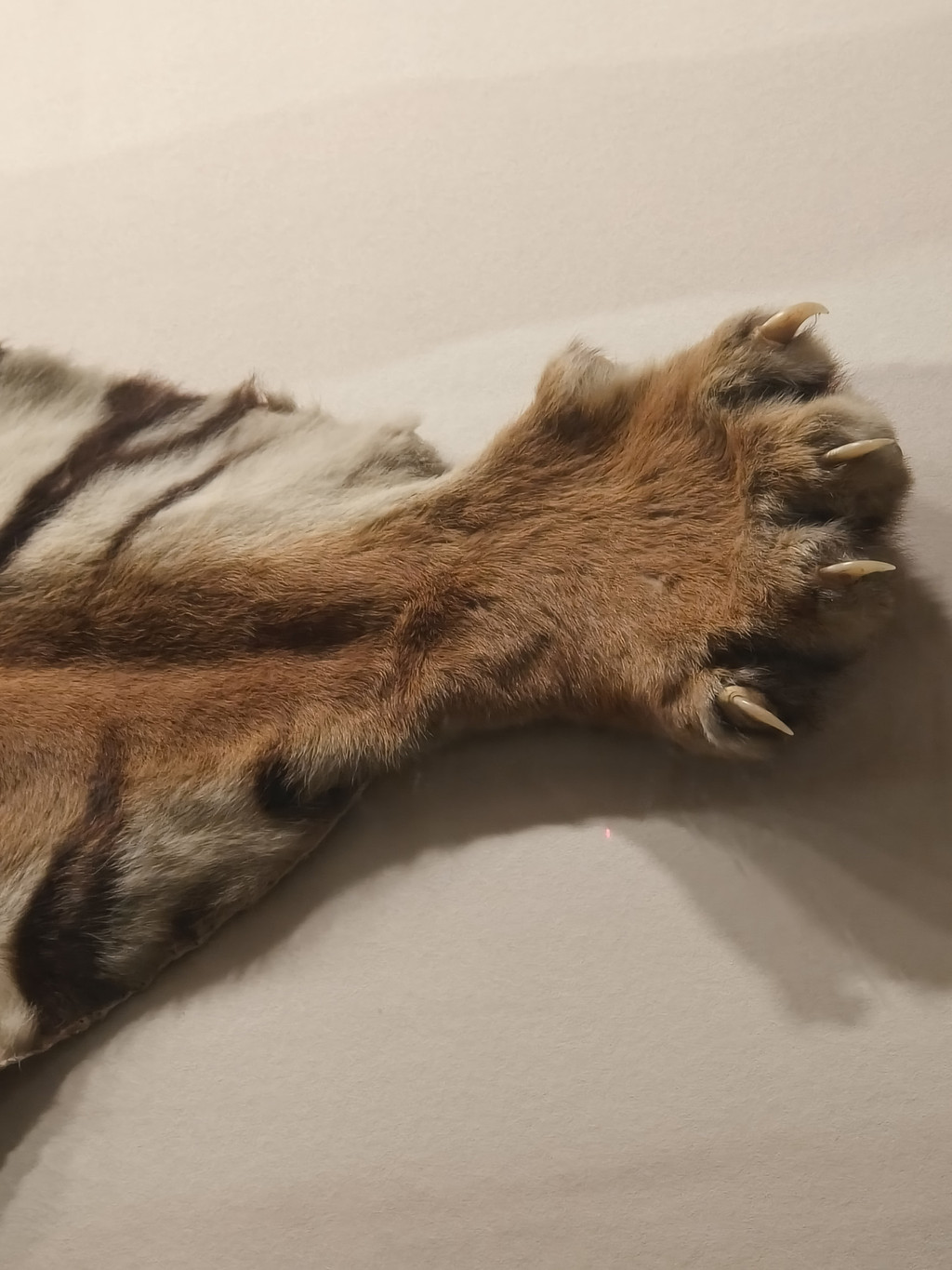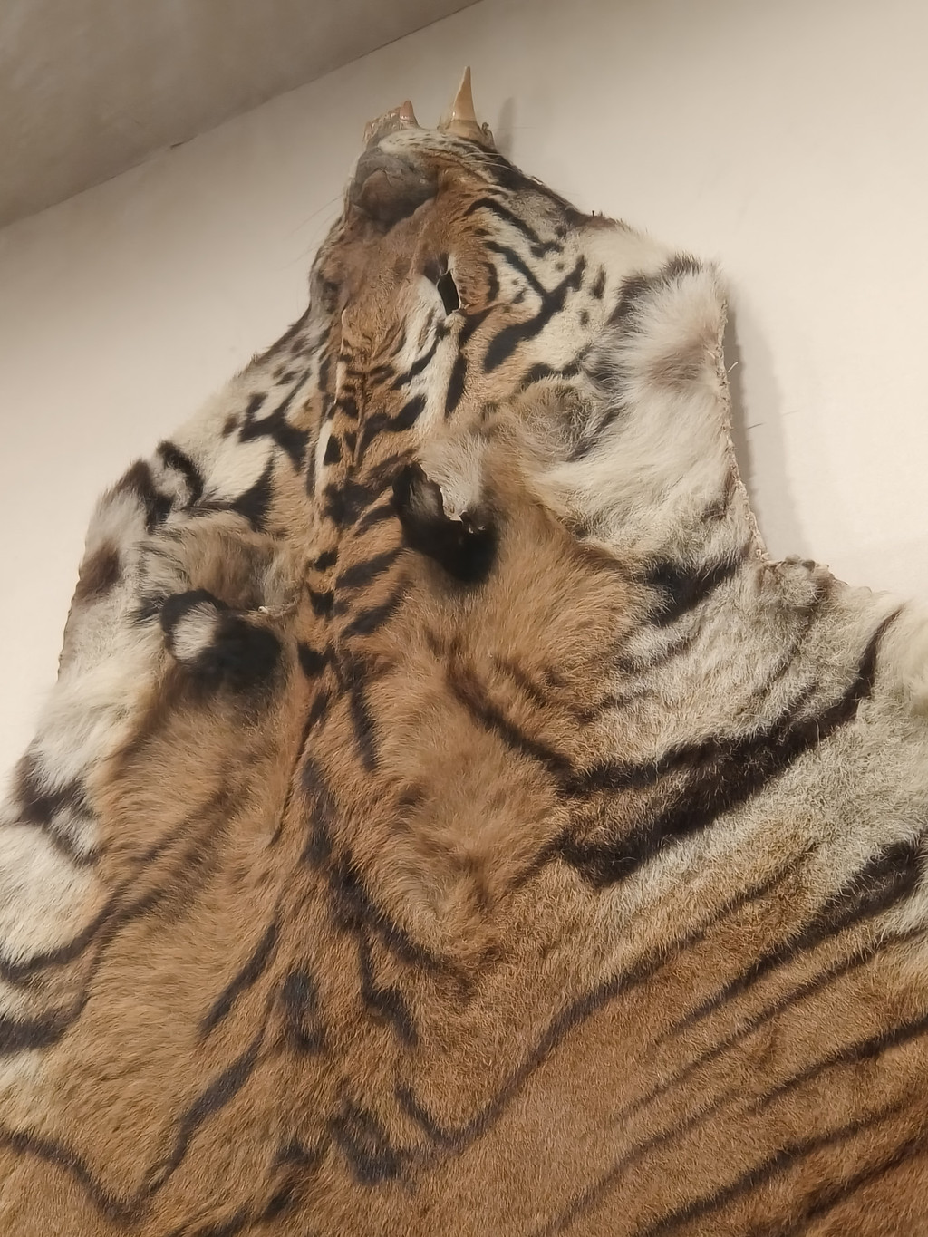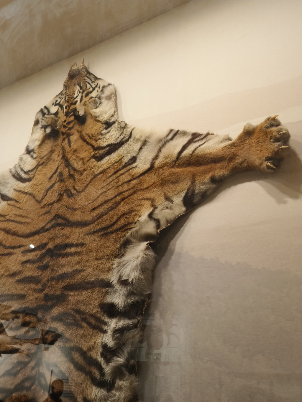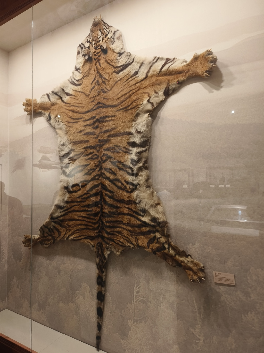 ↗东北虎皮标本。这是一具成年虎,体长近3米,制作于1928年。