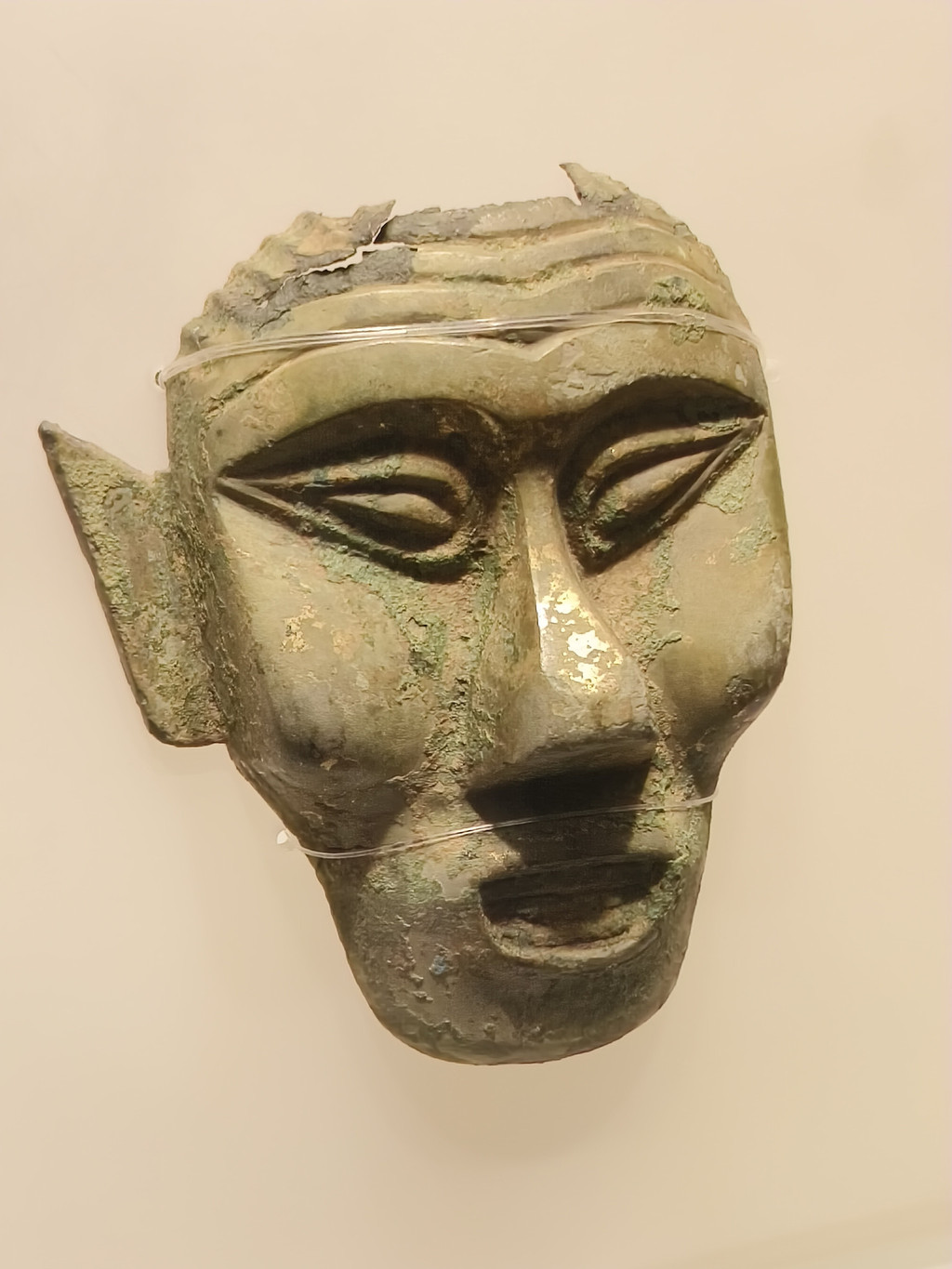 ↗鎏金铜面具(扶余)。容貌窄长,面部突起,额窄颧高,鼻平眼细,额上有三道横纹,是研究夫余男性相貌及冶炼技术的重要实物资料。