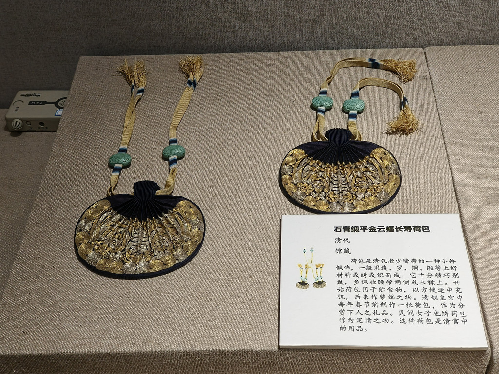↗荷包。一般用绫、罗、绸、缎或绣或织而成,开始是用来贮存食物,以便途中充饥,后逐渐演变为一种装饰品。