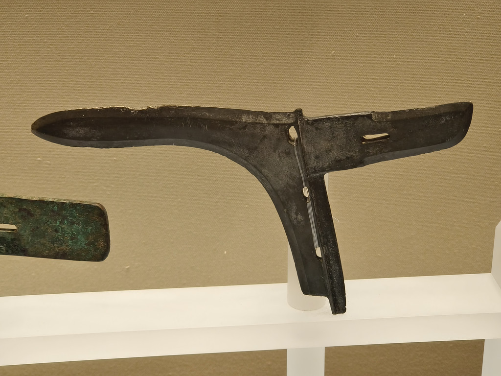 ↗“蔺相如”青铜戈(战国)。国家一级文物,发现于吉林省长白朝鲜族自治县,1996年2月征集。戈上刻有十六字铭文“廿年丞焛(蔺)相女(如),邦左囗鹿智,冶阳”。两行铭文中间的穿孔下有一“肖”(赵)字,戈援处刻“相邦”两字。大体意思是,公元前279年,宰相蔺相如监督制造了这一批兵器。铭文中“冶阳”系工匠名。这是迄今为止国内发现的唯一一件与战国名相蔺相如有关的稀世珍宝。公元前279年的渑池之会上,蔺相如大发神威,力挫强秦,为赵国保住尊严,逼迫秦王击缶。因立下大功被赵惠文王拜为上卿,位列武将第一的廉颇之上,由此让廉颇不满,发生了历史典故“负荆请罪”、“将相和”。