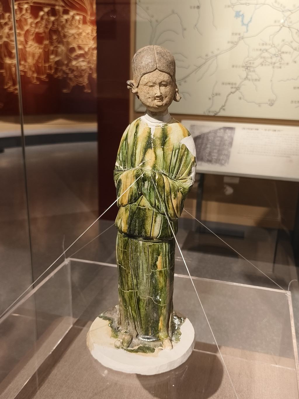↗三彩女俑(渤海)。渤海三彩借鉴唐三彩工艺,在日常用具、随葬明器、建筑构件上施黄、绿、褐三色釉,形成色彩鲜丽、独具特色的陶瓷器。